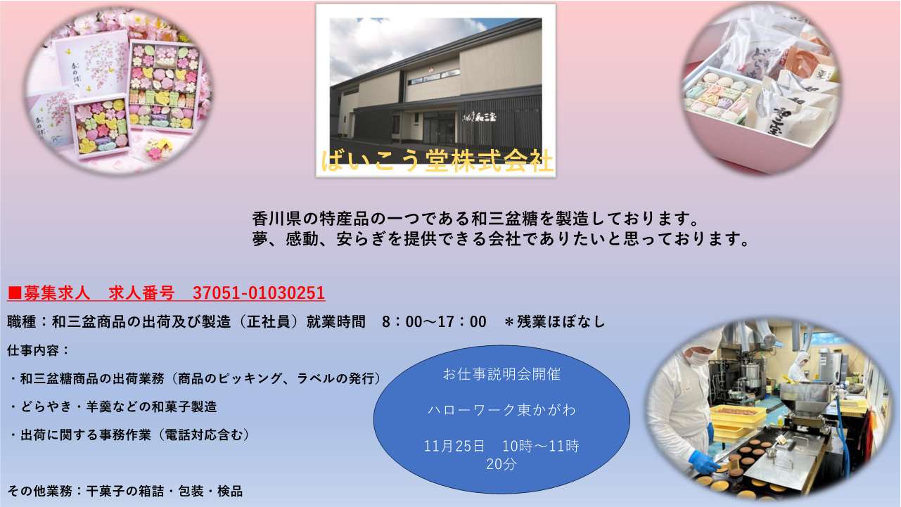 11月25日(火)10:00~11:20 ハローワークさぬき東かがわ出張所1階会議室にて「ばいこう堂株式会社 お仕事説明会」を開催いたします。