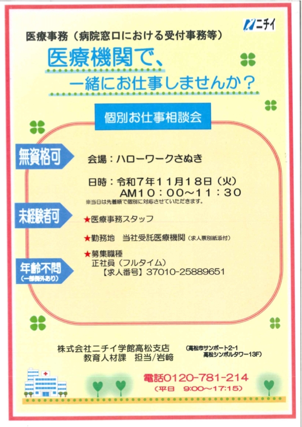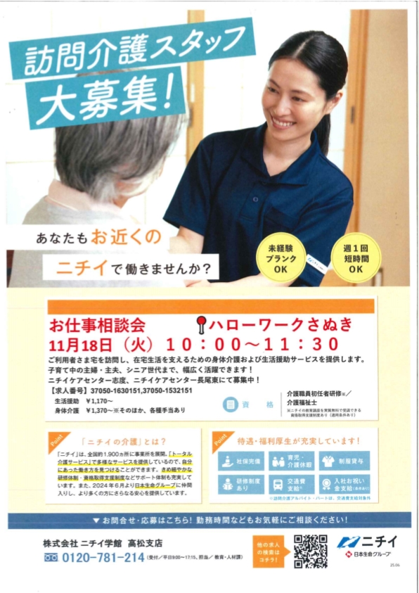 11月18日(火)ハローワークさぬき2階会議室にて「株式会社 ニチイ学館 デイリー説明会」を開催いたします。