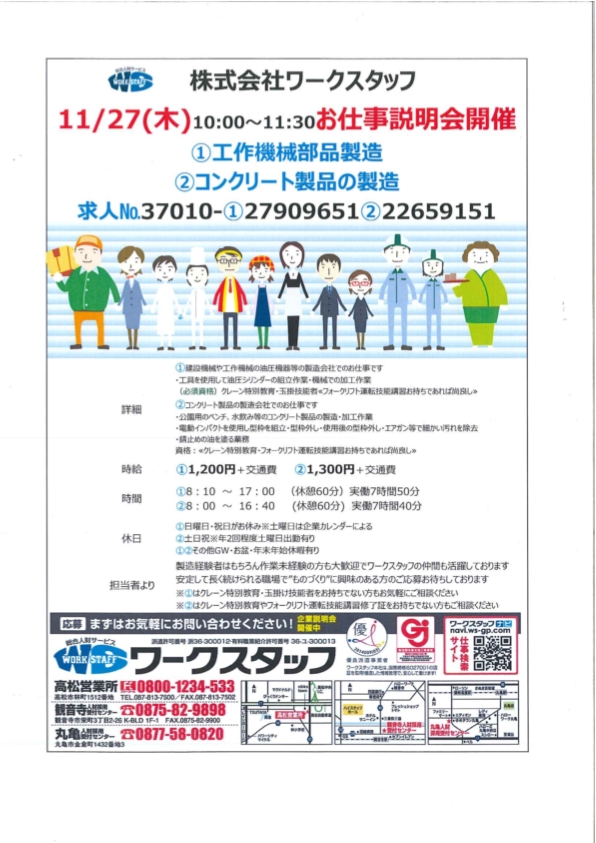 11月27日(木)ハローワークさぬき2階会議室にて「株式会社ワークスタッフ デイリー説明会」を開催いたします。