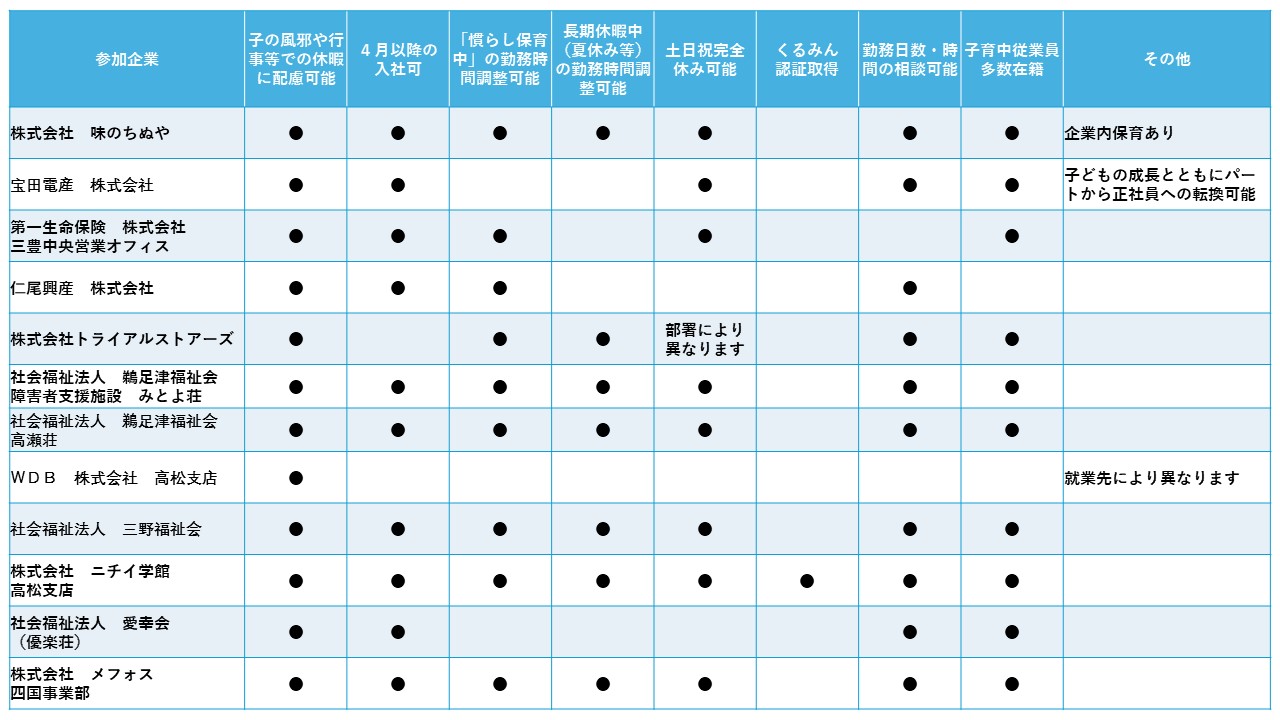 クリックした際、事業所の全ての求人が表示されますので、子育て中の方向け以外の求人や、三豊市以外の求人も表示されますが、ご了承ください。