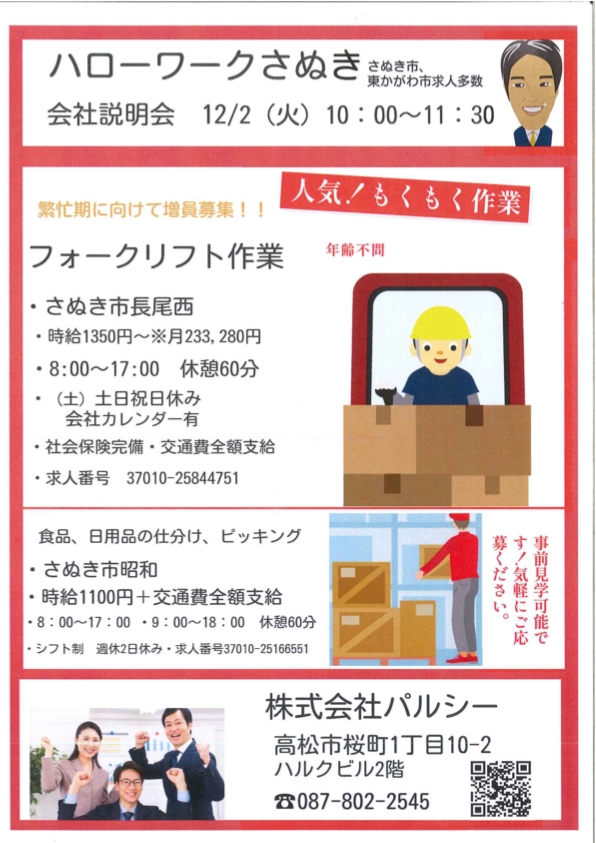 12月2日(火)ハローワークさぬき2階会議室にて「株式会社パルシー デイリー説明会」を開催いたします。