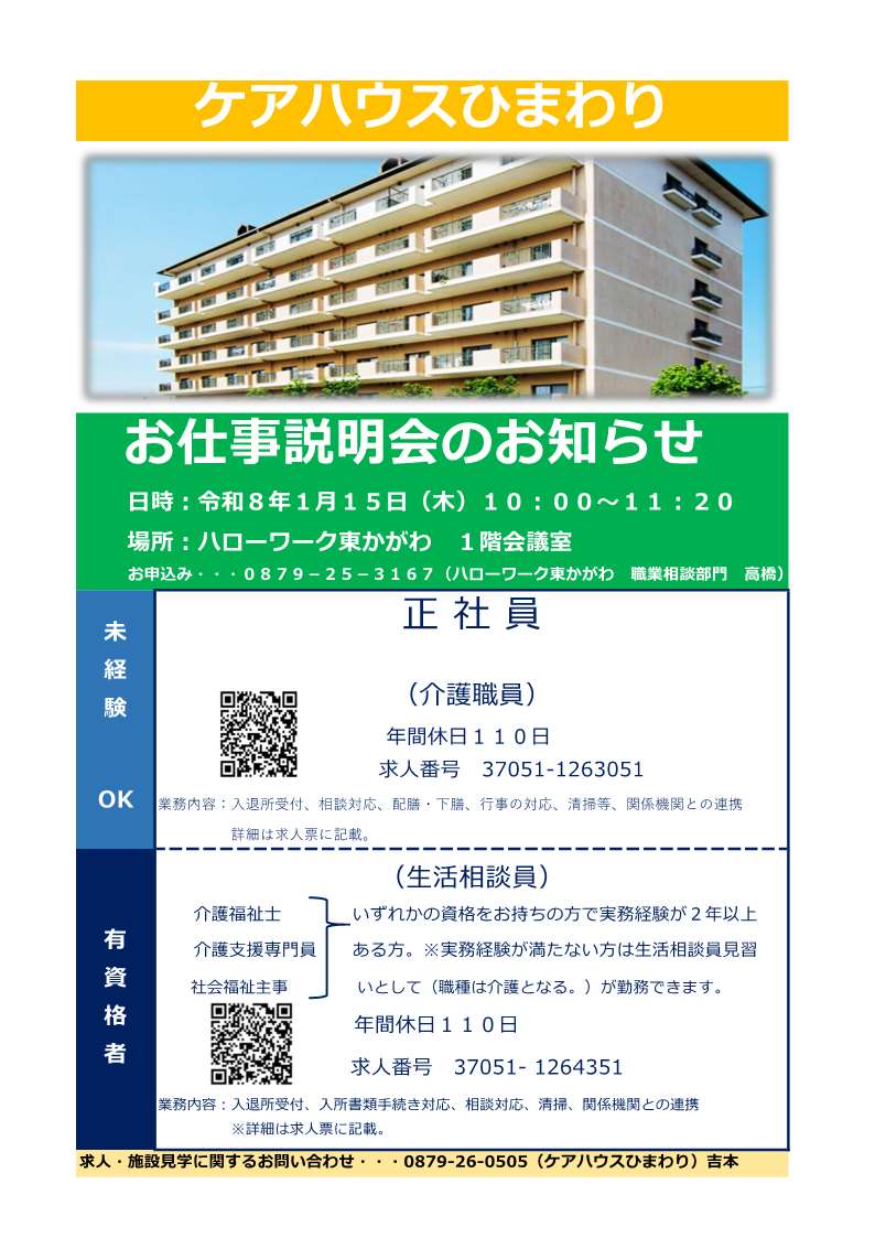 1月15日(木)10:00~11:20 ハローワークさぬき東かがわ出張所1階会議室にて「ケアハウスひまわり デイリー説明会」を開催いたします。