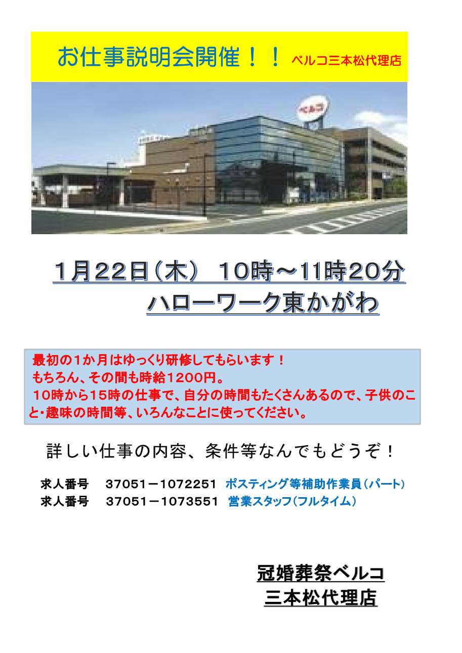 1月22日(木)10:00~11:20 ハローワークさぬき東かがわ出張所1階会議室にて「ベルコ三本松代理店 デイリー説明会」を開催いたします。