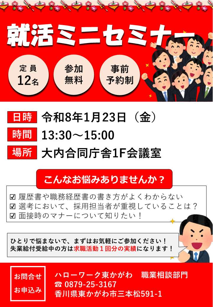 1月23日(金)13:30~15:00 ハローワークさぬき東かがわ出張所1階会議室にて「就活ミニセミナー」を開催いたします。応募書類の書き方や面接対策など就職活動のお悩みやポイントについて学ぶことができます。受講された方から大変好評なセミナーとなっております。