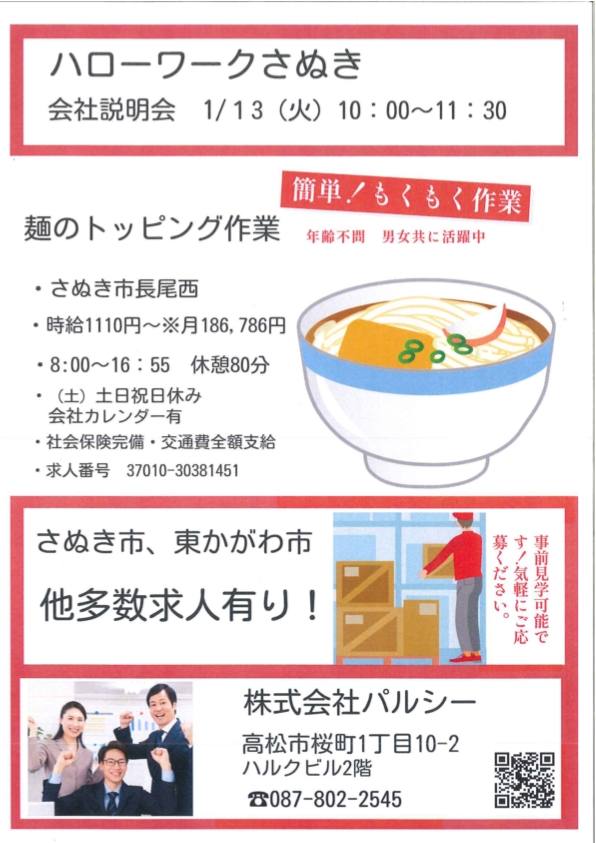 1月13日(火)ハローワークさぬき2階会議室にて「株式会社パルシー デイリー説明会」を開催いたします。