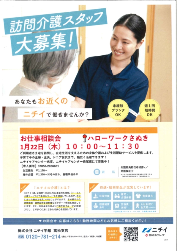 1月22日(木)ハローワークさぬき2階会議室にて「株式会社 ニチイ学館 高松支店 ニチイケアセンター志度デイリー説明会」を開催いたします。