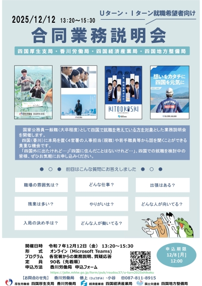 国家公務員として四国で就職を考えている方を対象としたオンライン業務説明会を開催します。四国(香川)に本局を置く4官署(四国厚生支局・香川労働局・四国経済産業局・四国地方整備局)が参加します。「四国外に出たけれど…」「四国に住んだことはないけれど…」など、四国での就職を検討中の皆様、ぜひお気軽にお申込みください。