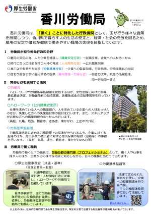 香川労働局は、「働く」ことに特化した行政機関として、国が行う様々な施策を展開しつつ、香川県で暮らす人の生活の安定と経済・社会の発展を図るため、雇用の安定や誰もが働きやすい職場の実現を目指しています。