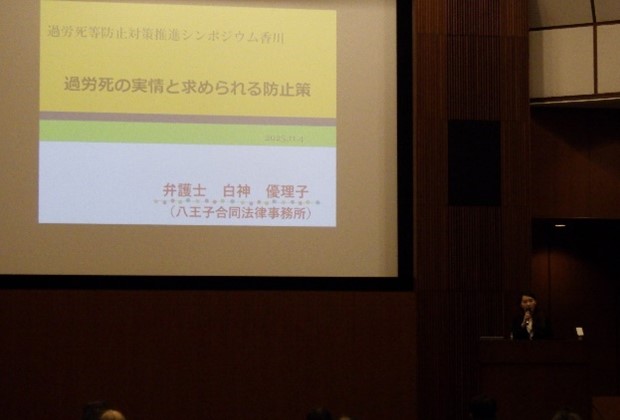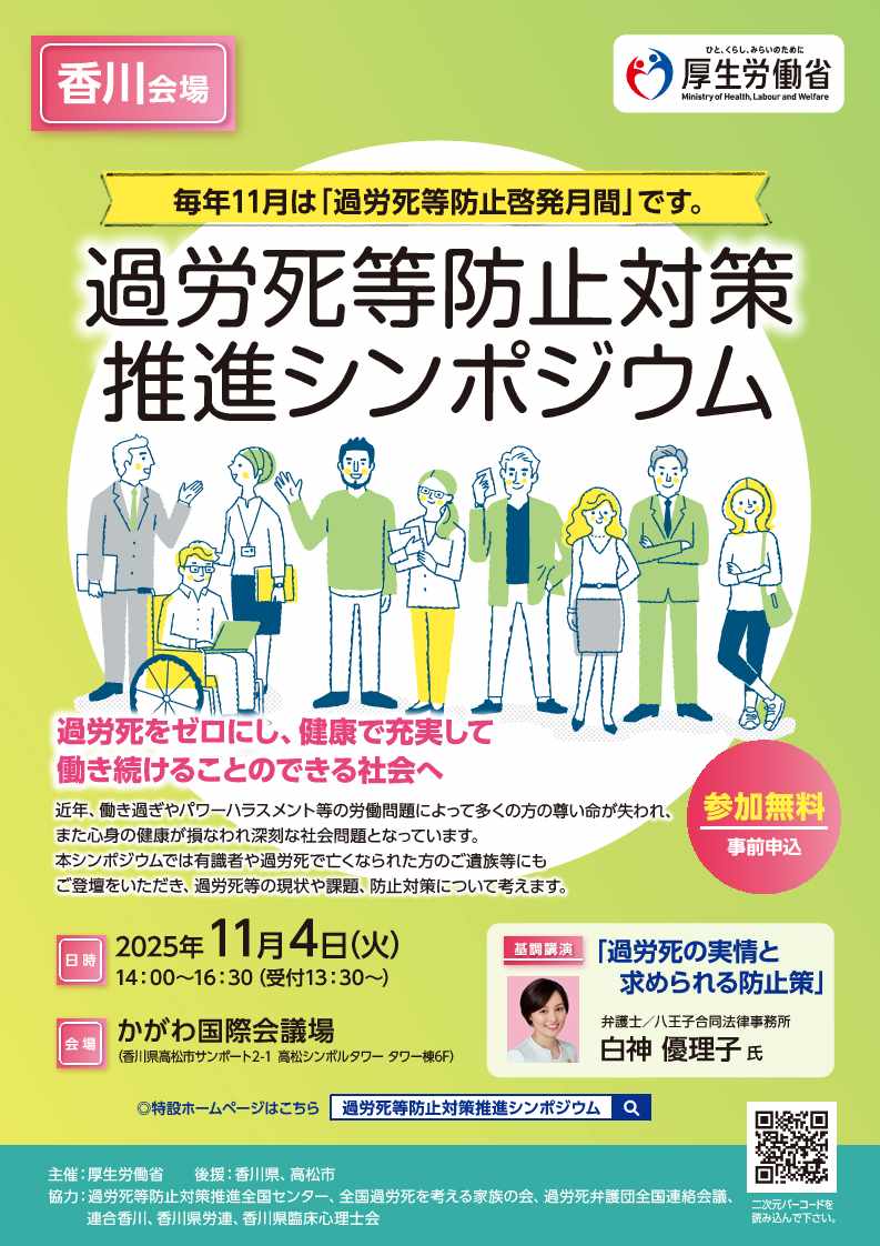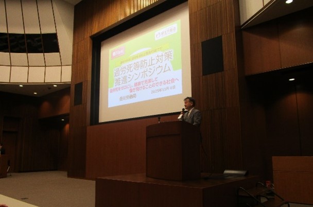 令和7年11月4日(火)、かがわ国際会議場(高松市サンポート 高松シンボルタワー)でシンポジウムを開催し、過労死等の現状や課題、防止対策について考えるとともに、過労死等の防止を推進することの重要性を改めて認識する機会とするため、有識者や過労死で亡くなられた方のご遺族等にご登壇をいただきました。