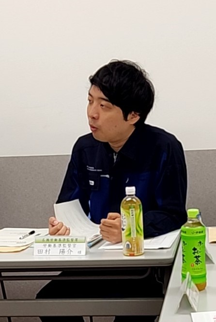 各社の安全衛生取組発表の司会を行う名瀬労働基準監督署 田村監督官