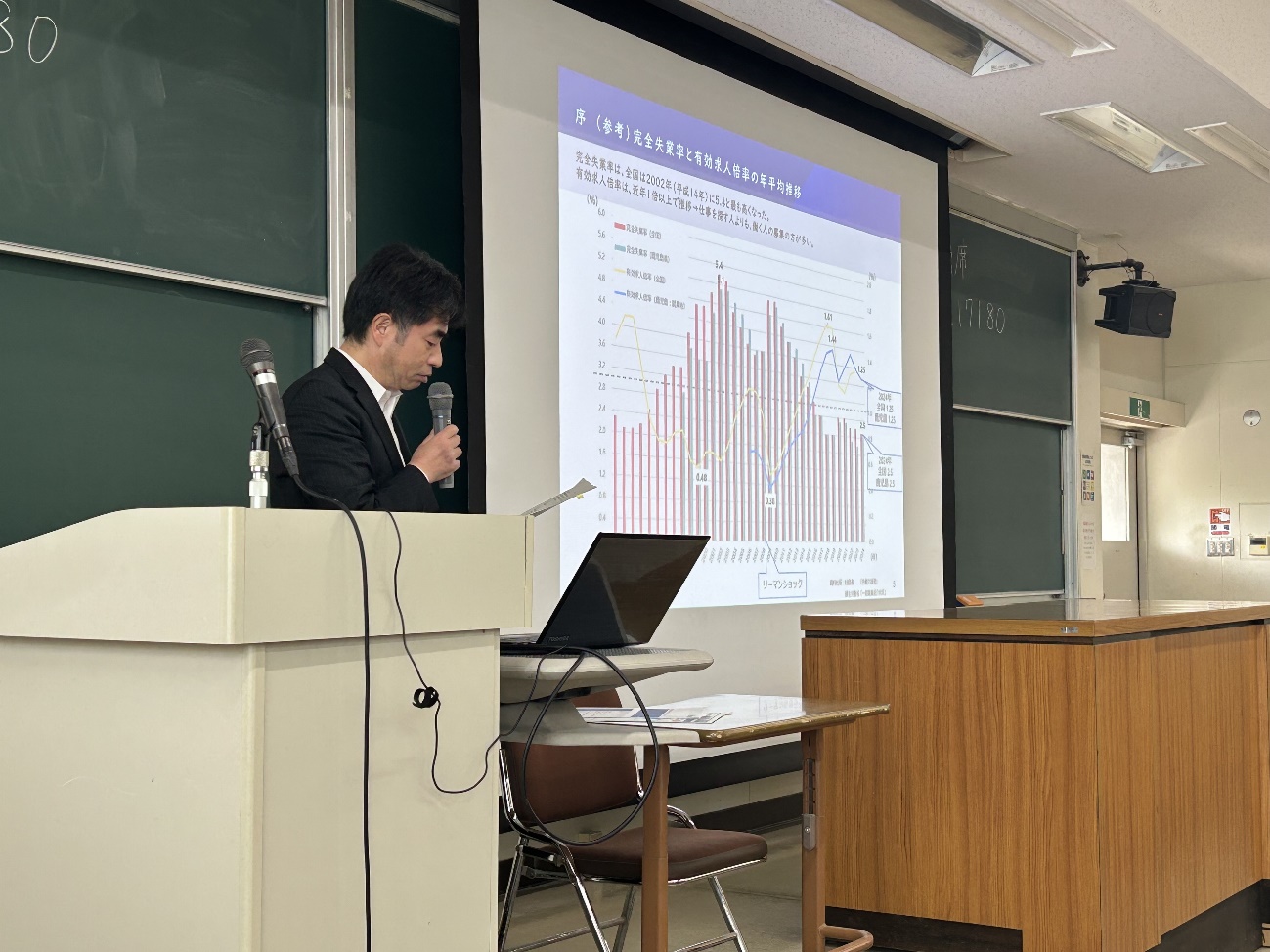 鹿児島労働局長が鹿児島大学法文学部を訪問し、職場におけるハラスメントの現状について統計を用いて説明するとともに、事業主が講ずべき措置や具体的なハラスメントの事例、被害に遭った時の対応方法等についての説明を行いました。