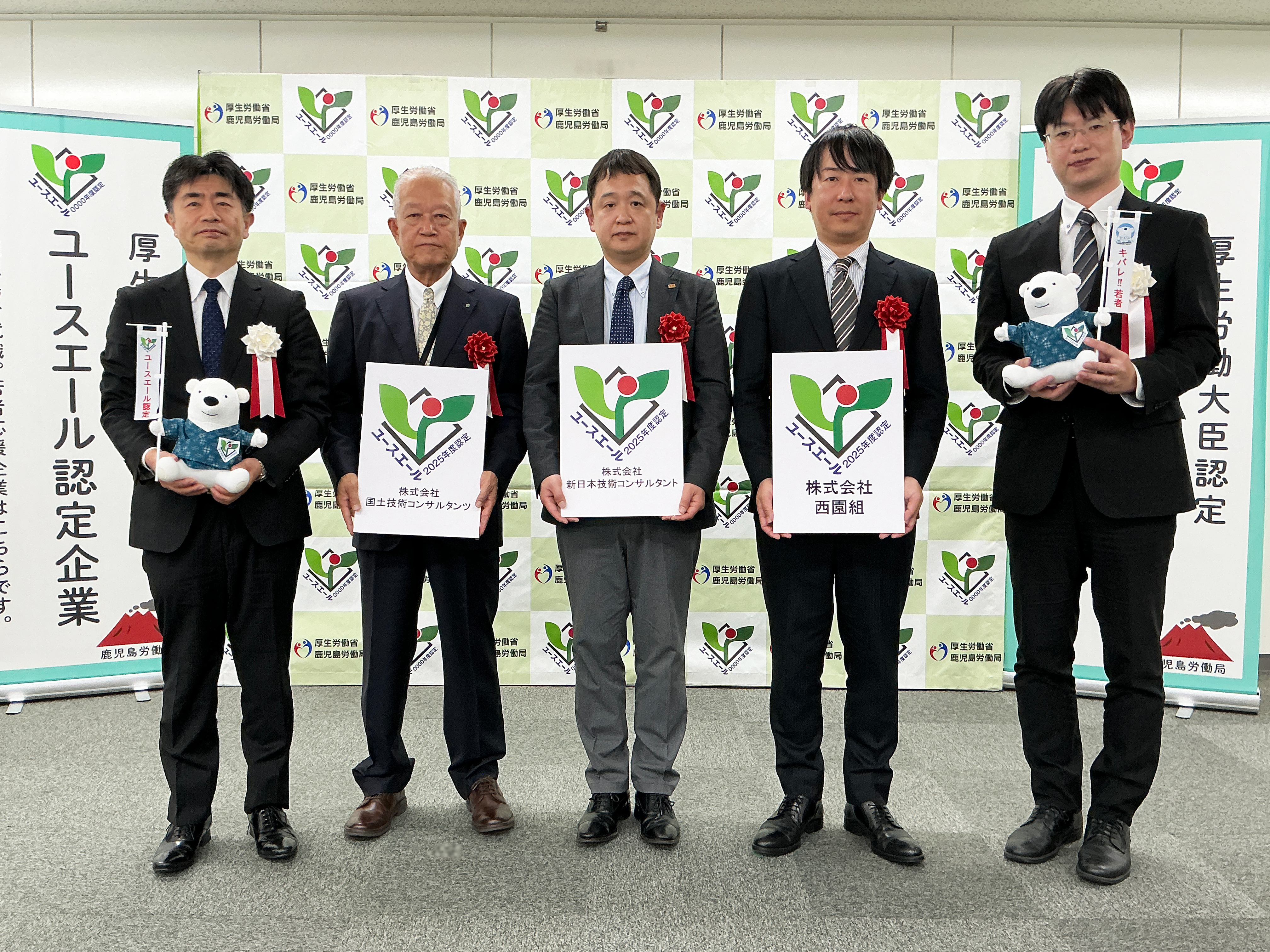 左から 労働局長、株式会社 国土技術コンサルタンツ、株式会社 新日本技術コンサルタント、株式会社 西園組、職業安定部長