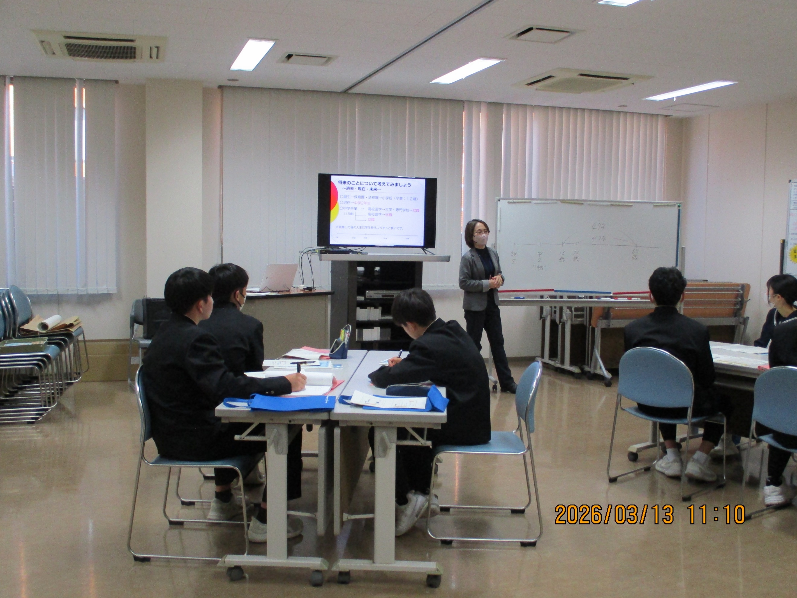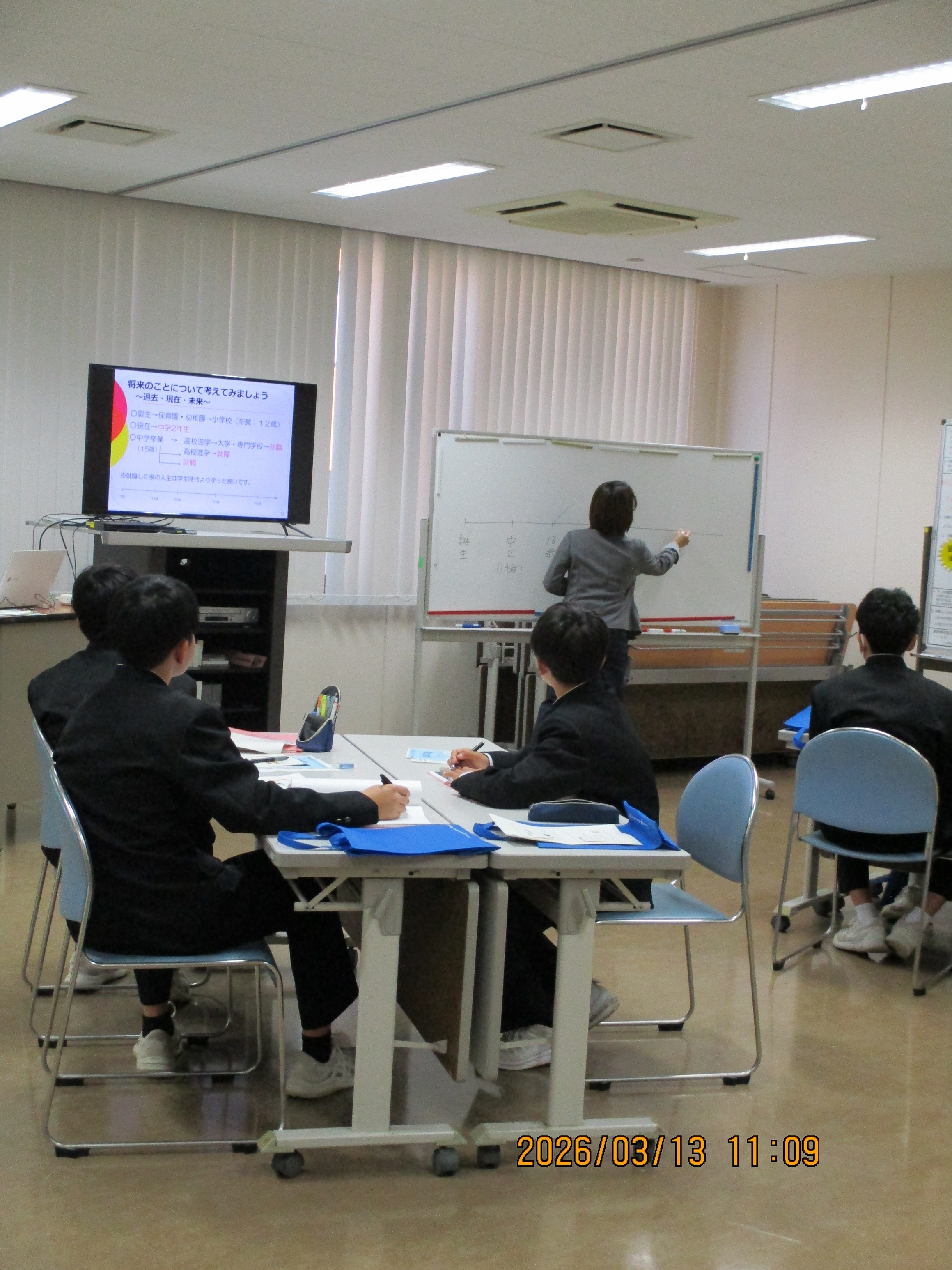 「自分の能力や適性を知り、自己理解を図るとともに望ましい人生観・職業観を培い、自己実現に向かって自立する態度を養う」をテーマに講話を行い、社会人として働く上で大切なことについて説明しました。また、2組に分かれてグループワークを実施し、「働くこと」について話し合いました。