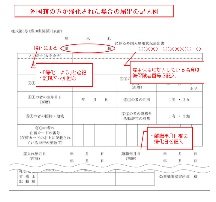 雇用保険の被保険者であるなしにかかわらず、帰化の旨を管轄のハローワークへご連絡ください。