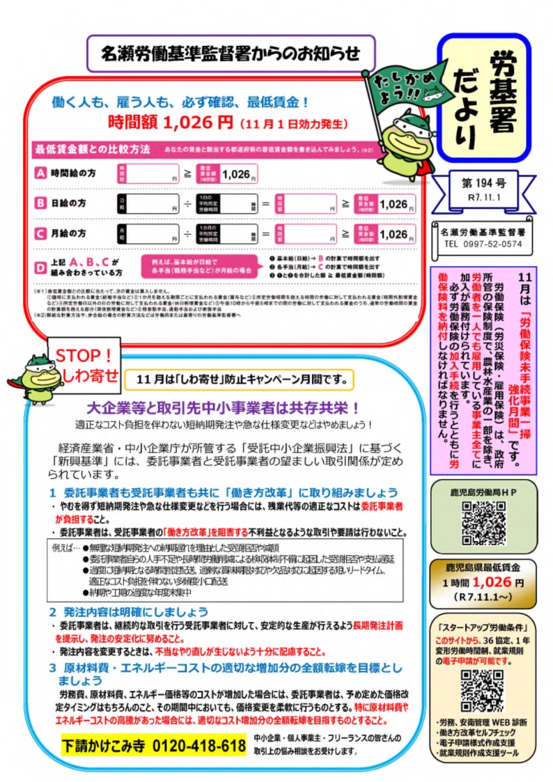 労基署だより第194号 令和7年11月1日発行(名瀬労働基準監督署)[PDF形式:1,007KB]