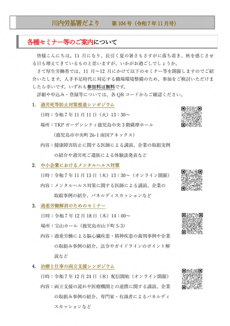 川内労基署だより 第104号(令和7年11月号)(川内労働基準監督署)[PDF形式:4,404KB]