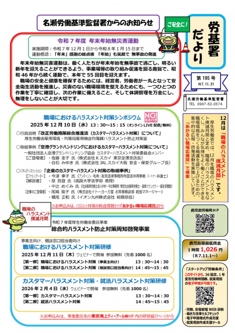 労基署だより第195号 令和7年11月21日発行(名瀬労働基準監督署)[PDF形式:872KB]