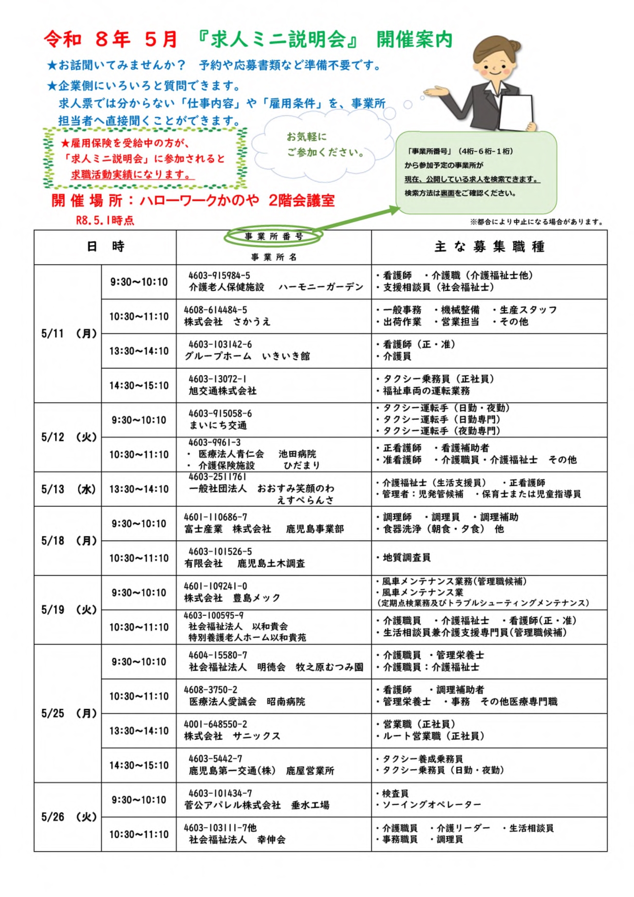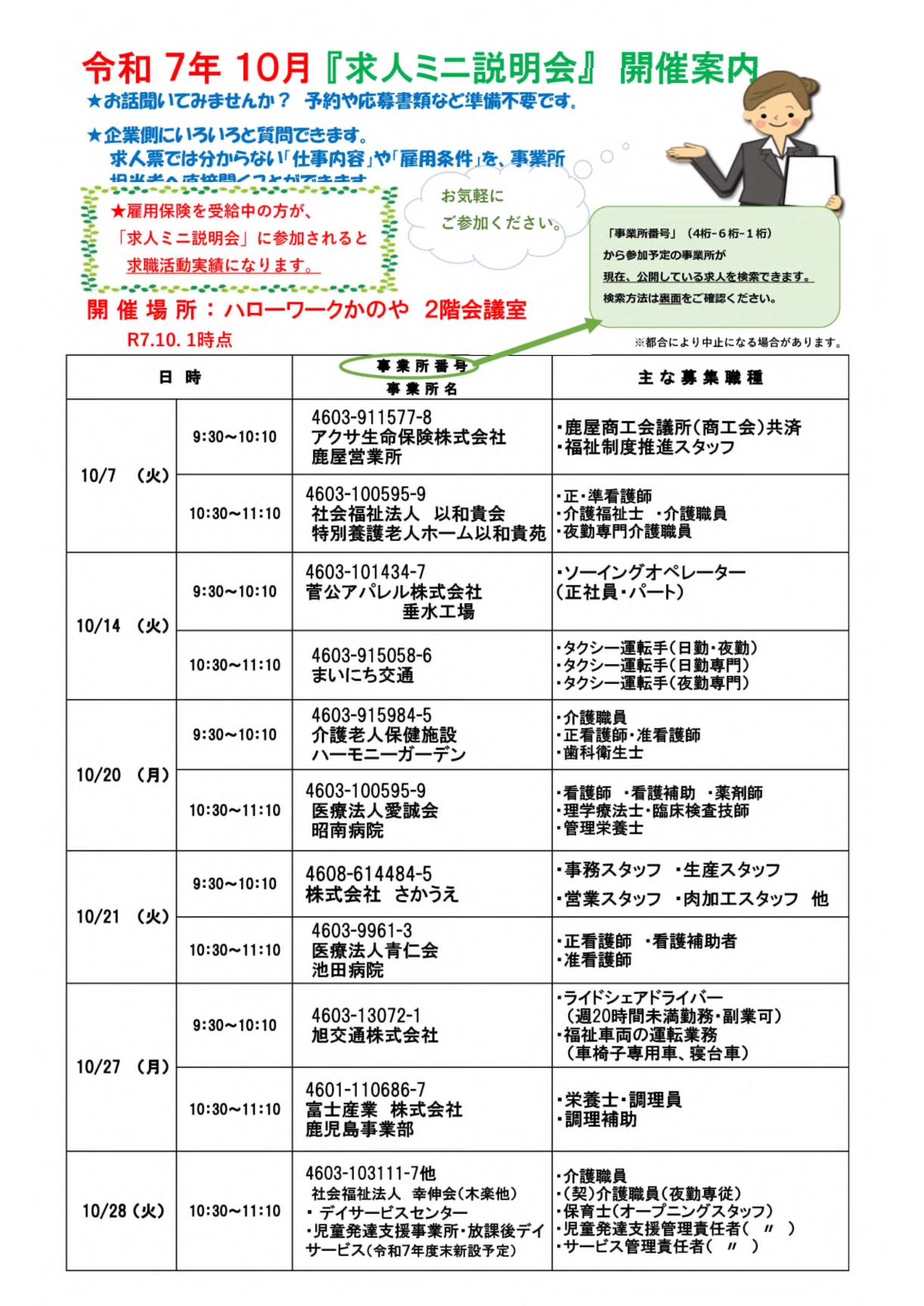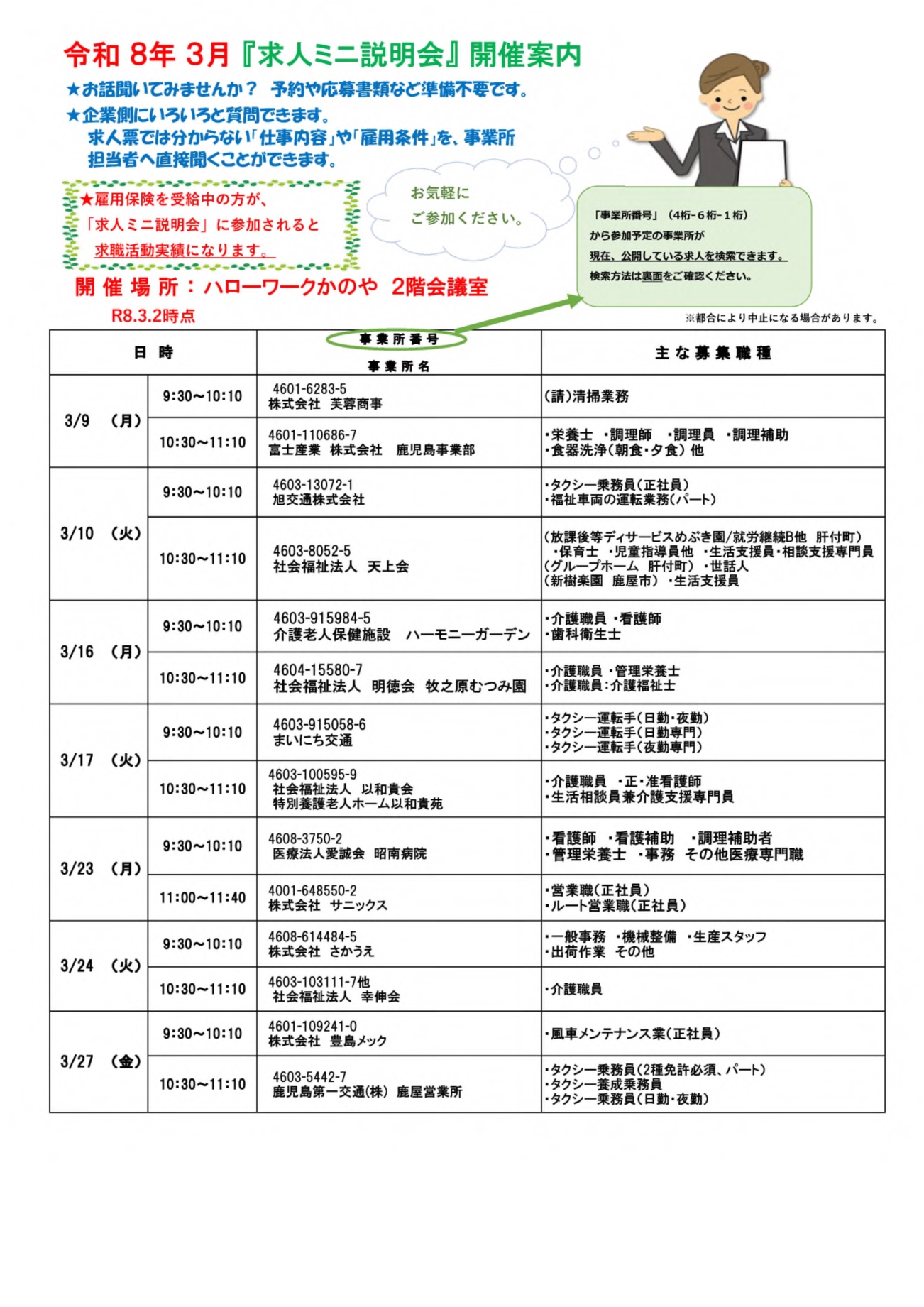 - ハローワーク鹿屋で開催できる、各回1社ずつの説明会です。