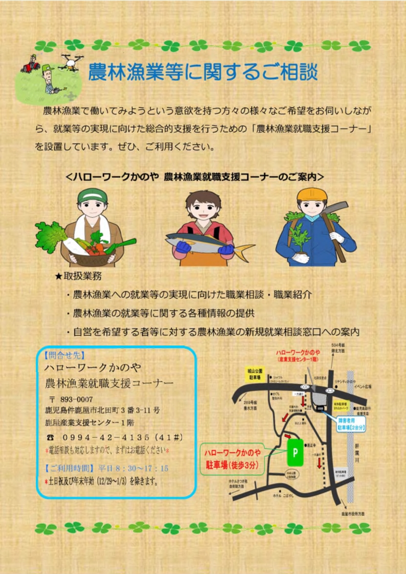 - U・Iターンによる鹿児島県内での就職を検討中の方、農林漁業への就職を希望される方、外国人の方など、個別の支援が必要な方向けの職業相談や職業紹介を行っています。