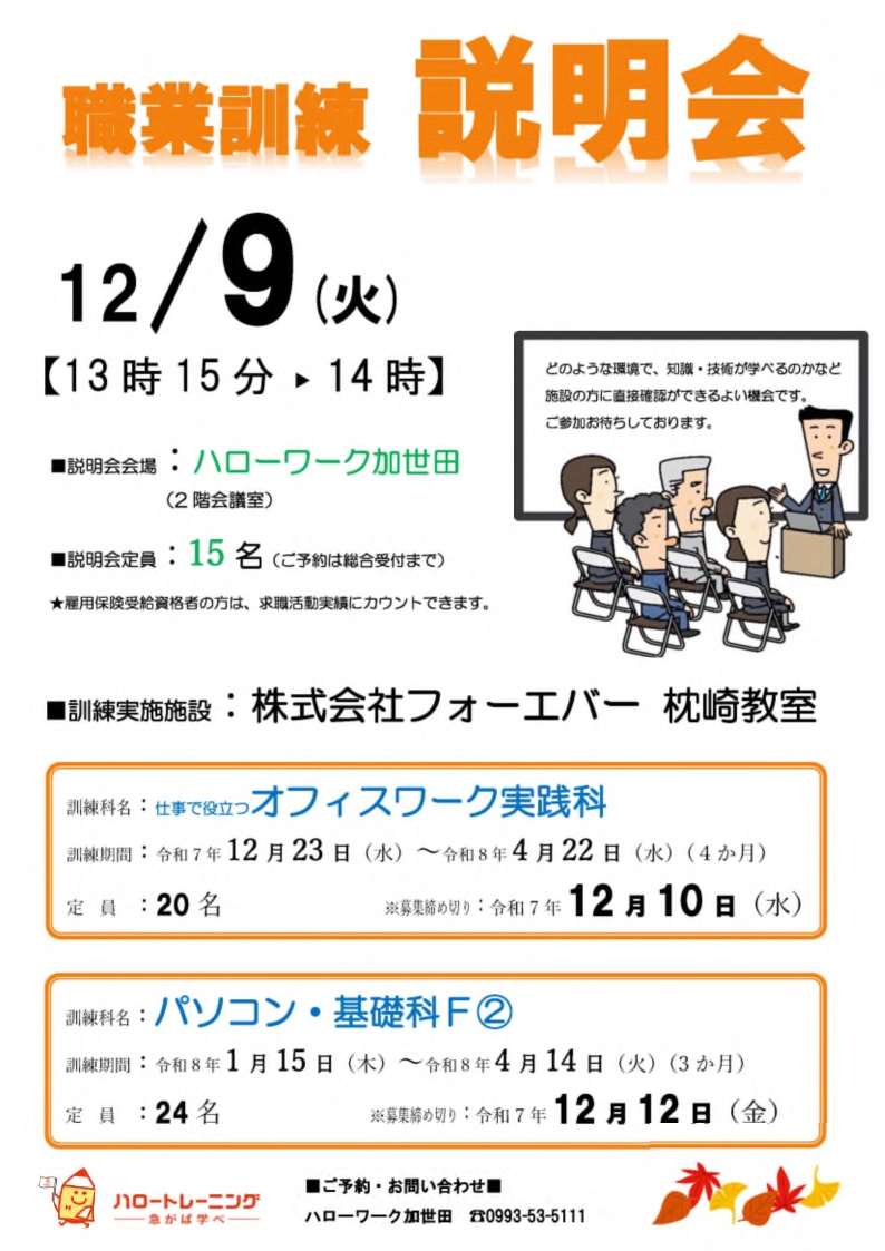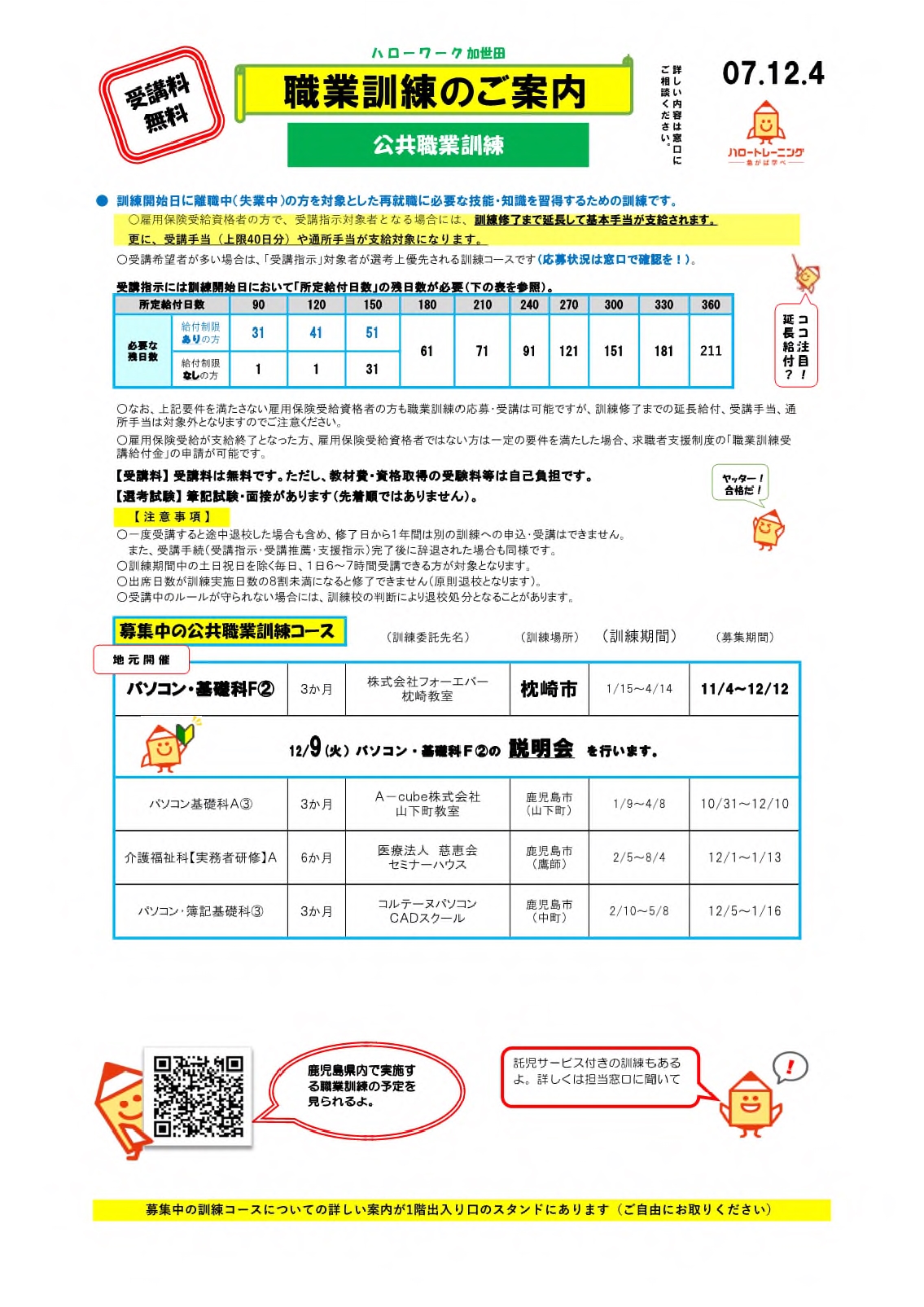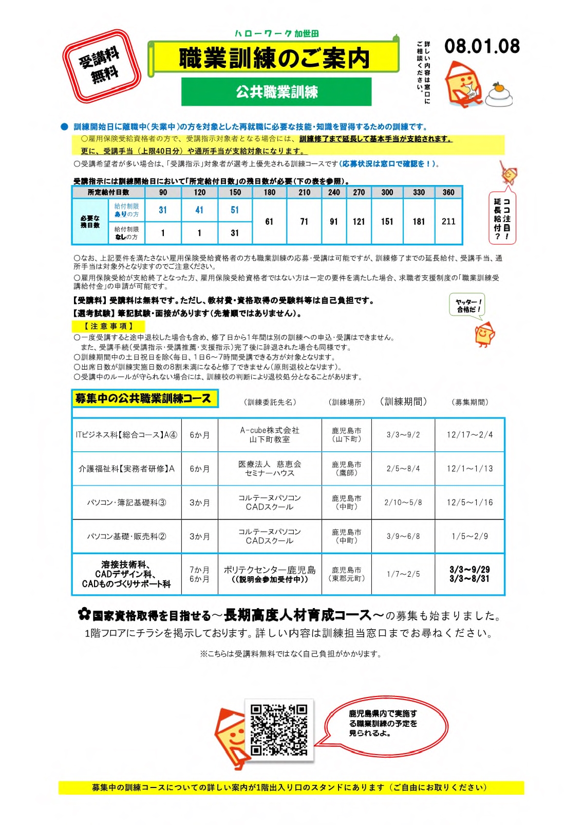 - 地元開催の訓練についてはハローワーク加世田で訓練内容等の説明会も開催しております!日程が決まりましたら以下にチラシを掲載しますので気になる方はそちらをご確認ください!