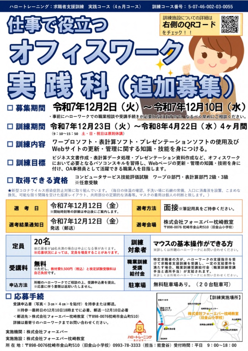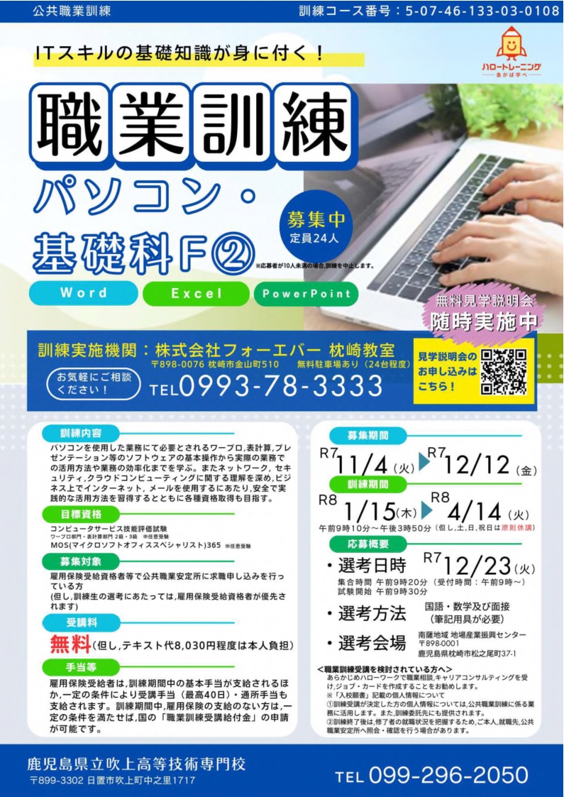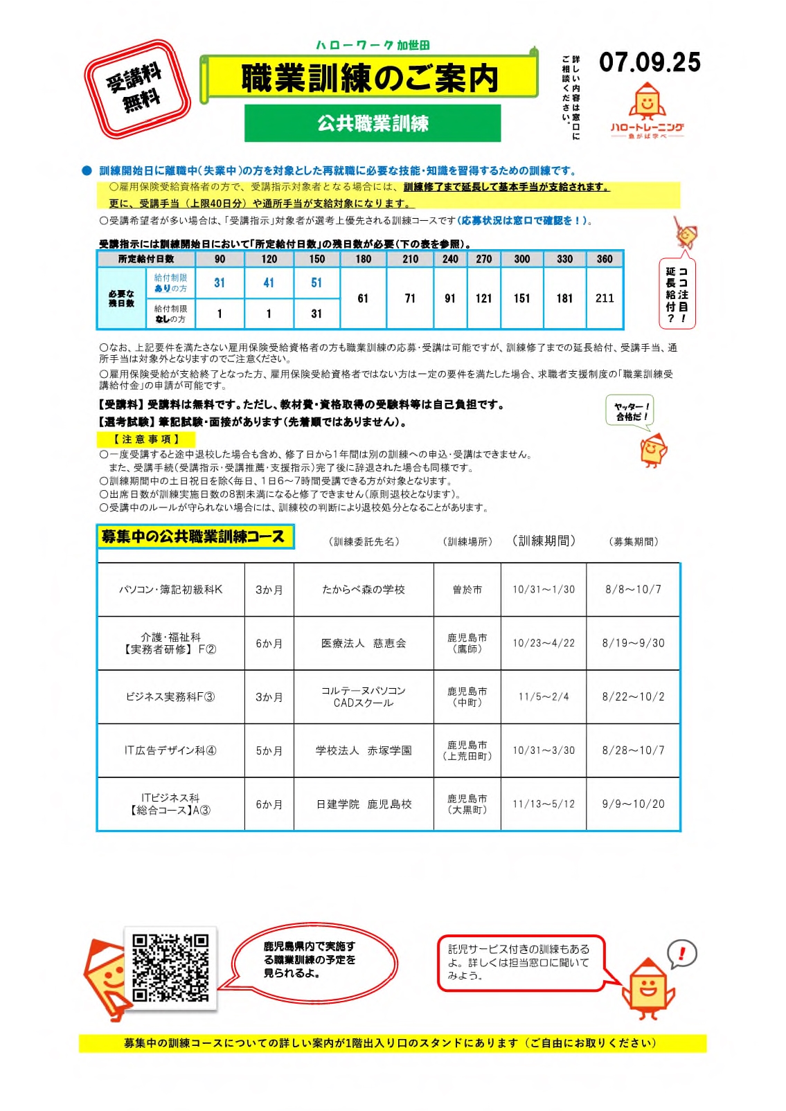 - 地元開催の訓練についてはハローワーク加世田で訓練内容等の説明会も開催しております!日程が決まりましたら以下にチラシを掲載しますので気になる方はそちらをご確認ください!