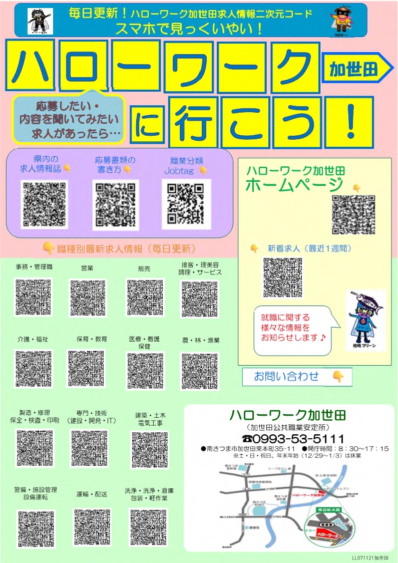 - ハローワーク加世田発行の求人情報誌(南さつま市、南九州市(知覧町・川辺町)、枕崎市)を見ることができます。