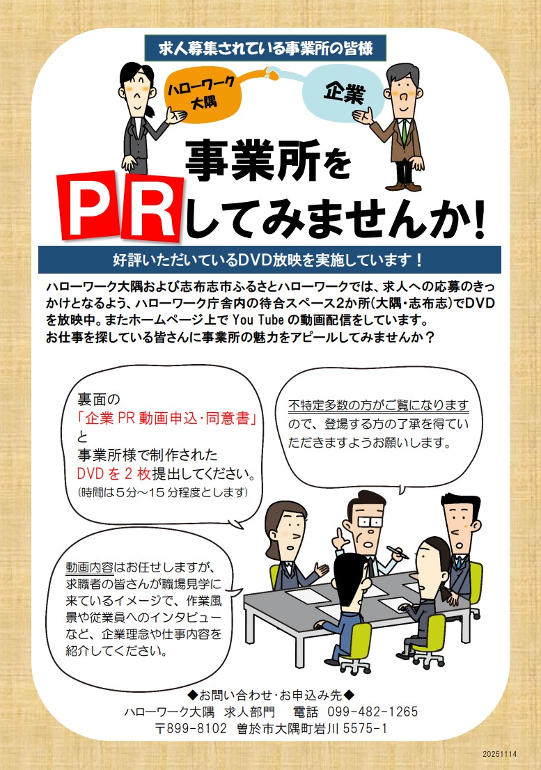 地元企業のPR動画を見てみる - ハローワーク大隅内で事業所PR動画を放映しませんか?