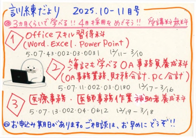 - 稀に日程等の内容について変更が発生することがありますので、職業訓練窓口にてご確認ください。