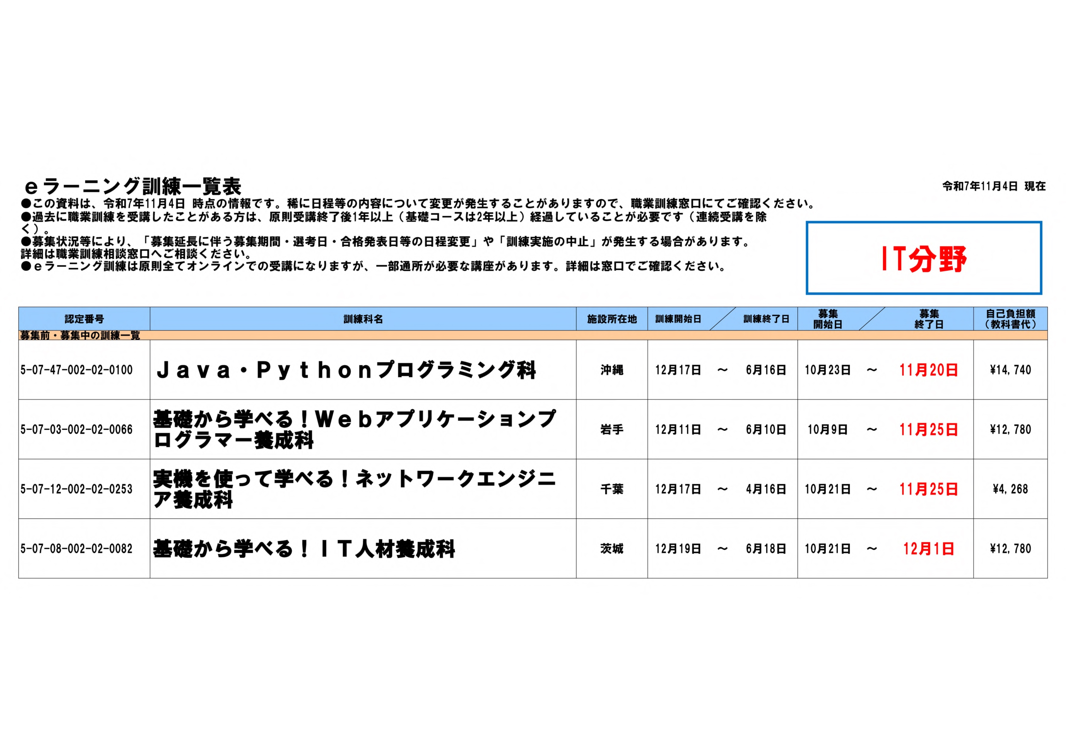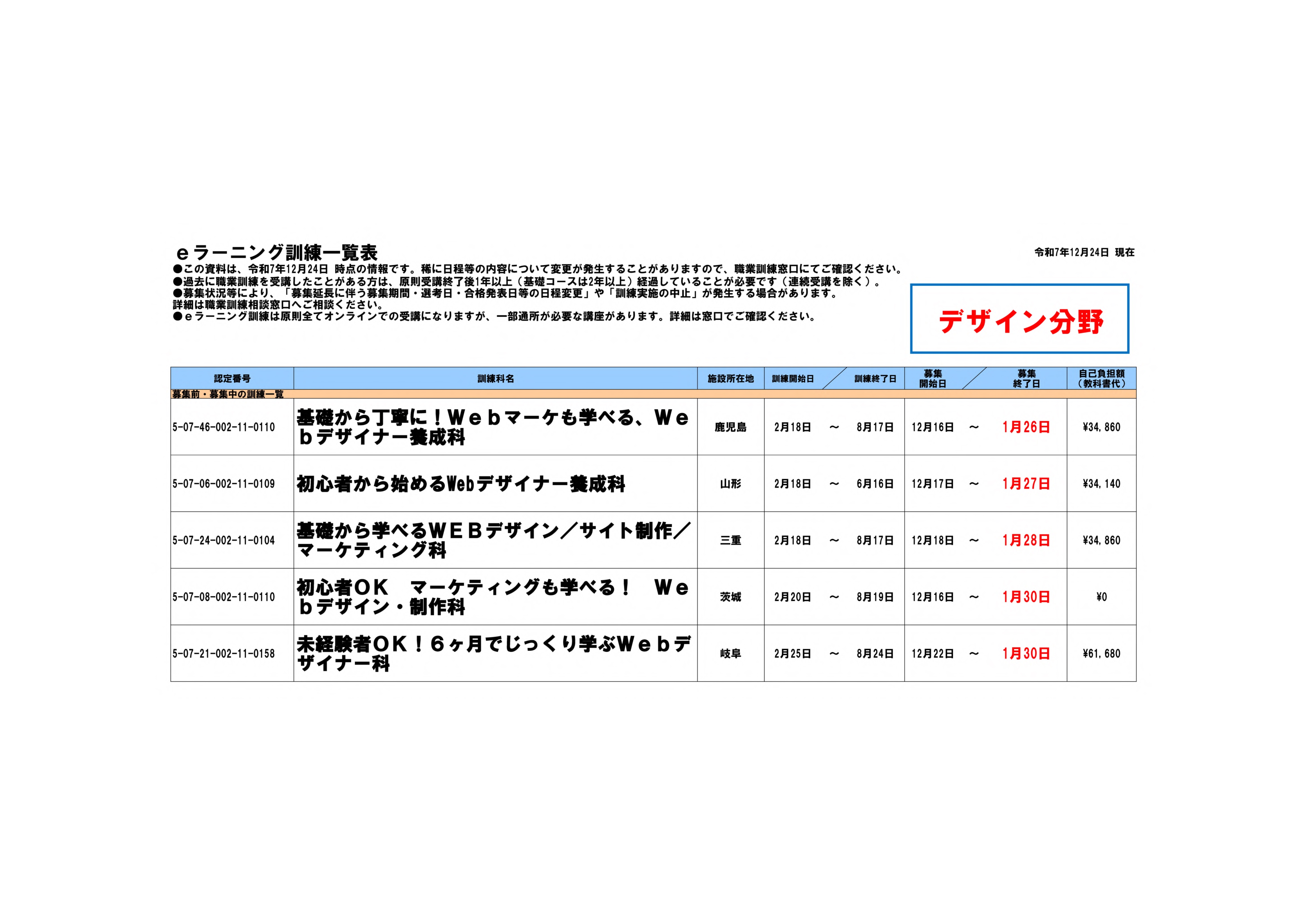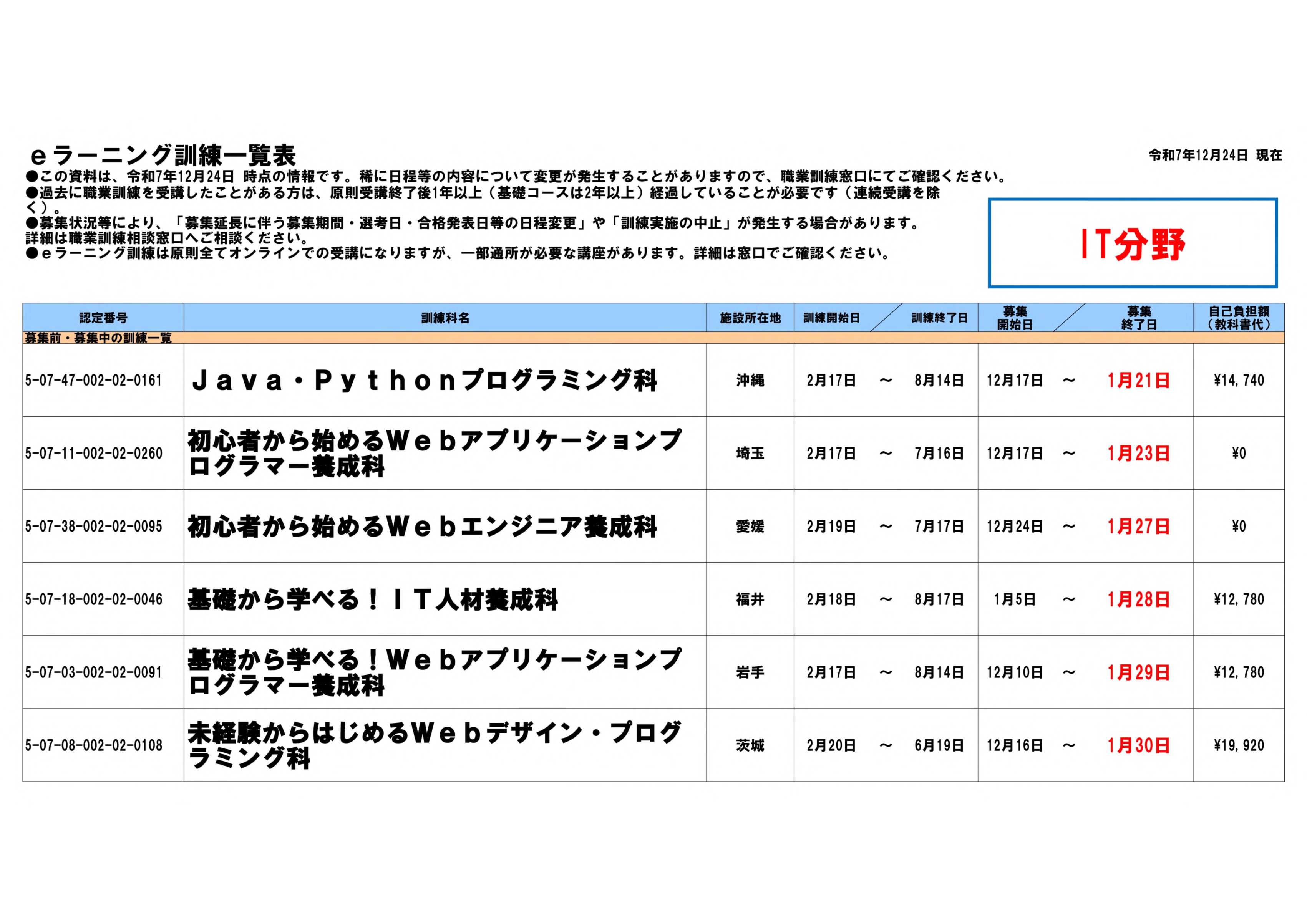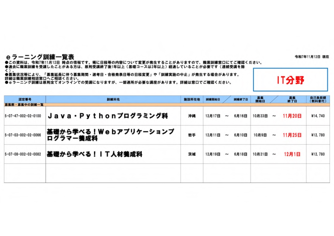 - 募集状況等により、「募集延長に伴う募集期間・選考日・合格発表日等の日程変更」や「訓練実施の中止」が発生する場合があります。