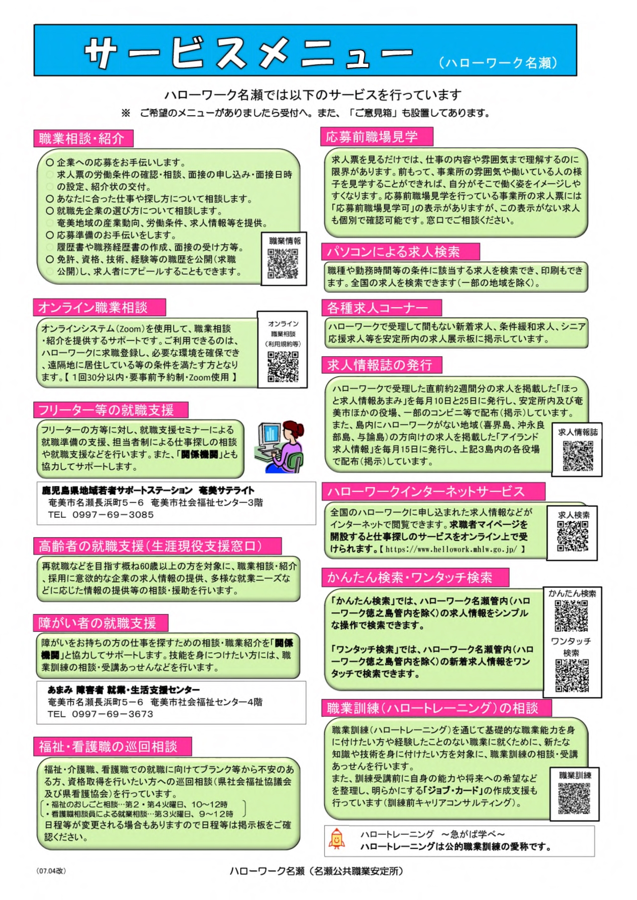 - ハローワーク名瀬発行の求人情報誌(奄美市、龍郷町、大和村、瀬戸内町、宇検村、喜界島、沖永良部島、与論島)を見ることができます。