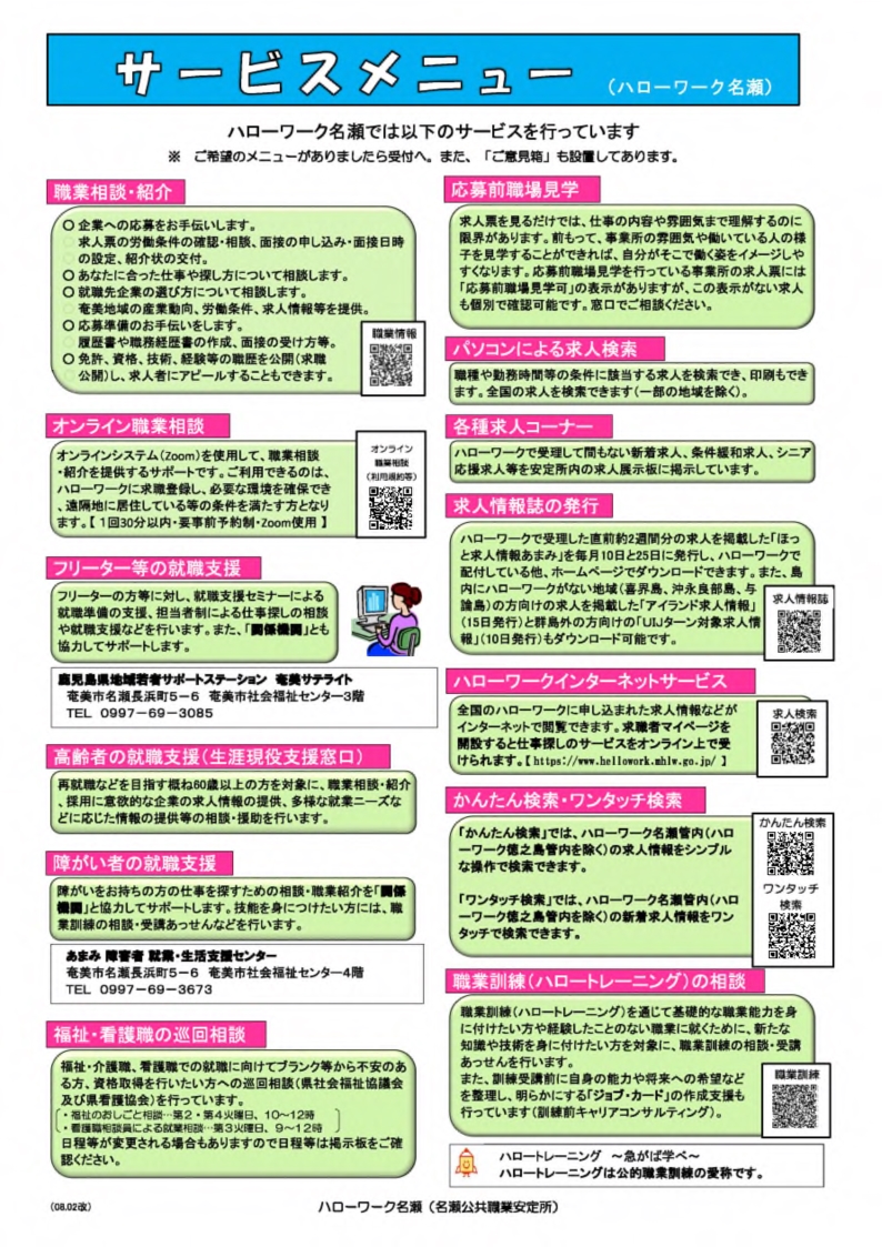 事業所の皆さま向けサービスメニュー(ハローワーク名瀬が人材確保のお手伝いをいたします!)