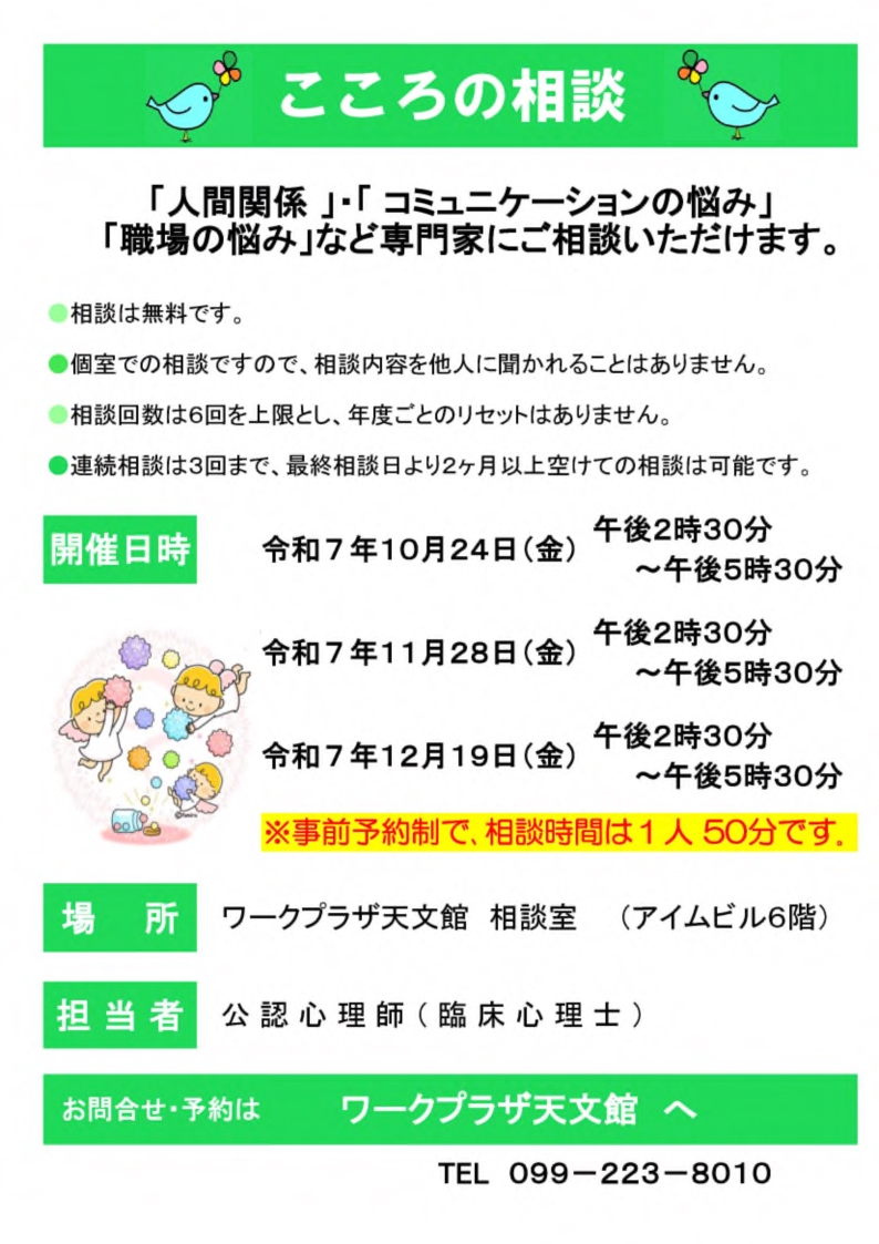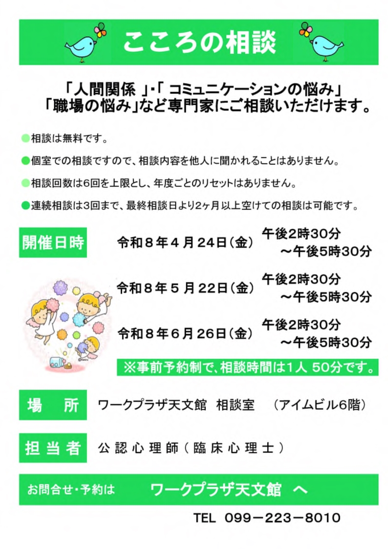 ワークプラザ天文館の「臨床心理士による【こころの相談】」を更新しましたNEW
