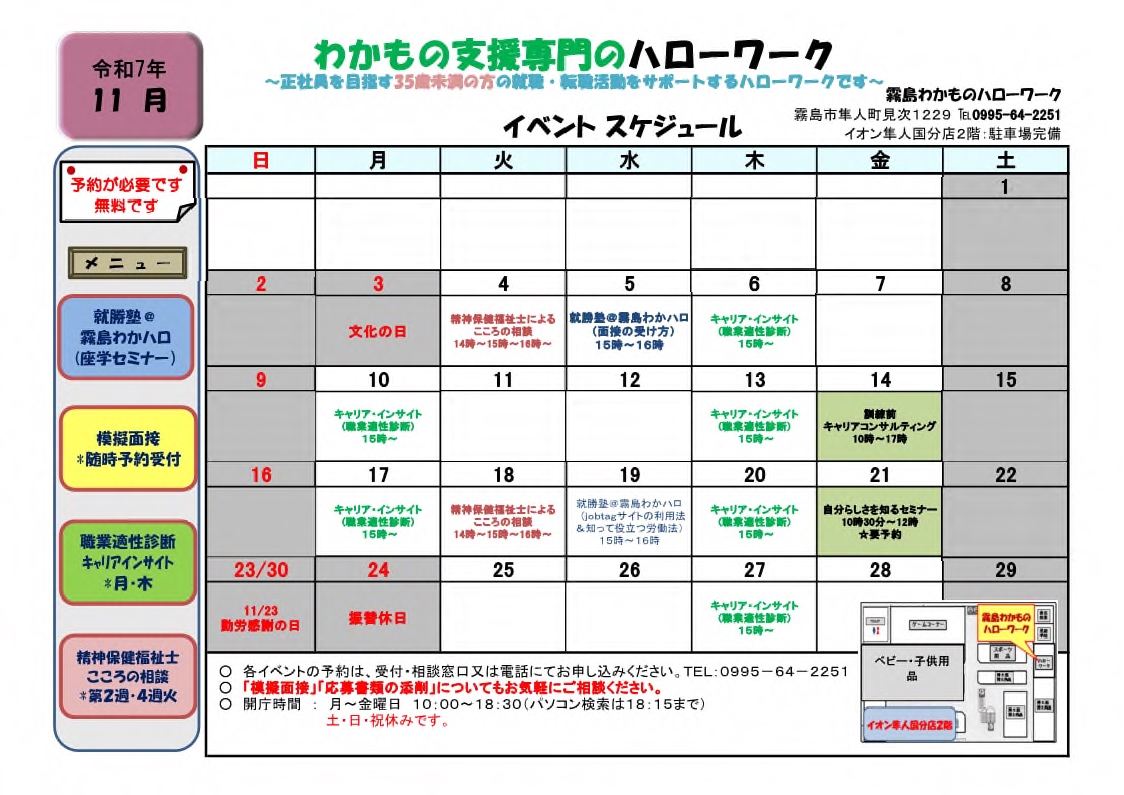- きりわか(霧島わかものハローワーク)では、職業相談・職業紹介、就職支援セミナーなど、正社員就職に向けた支援を行っています!