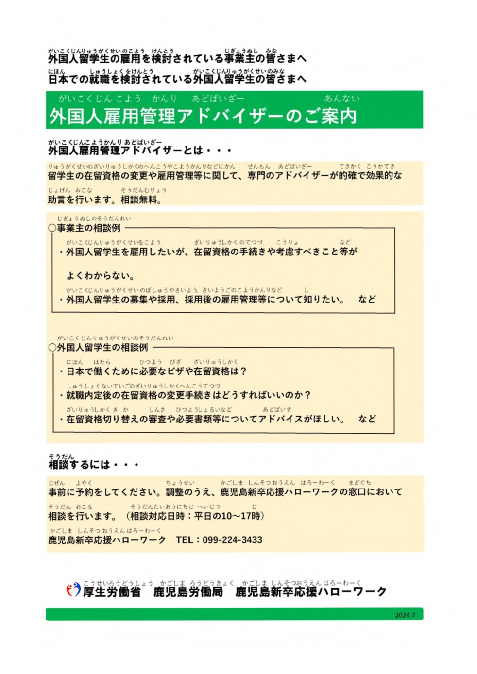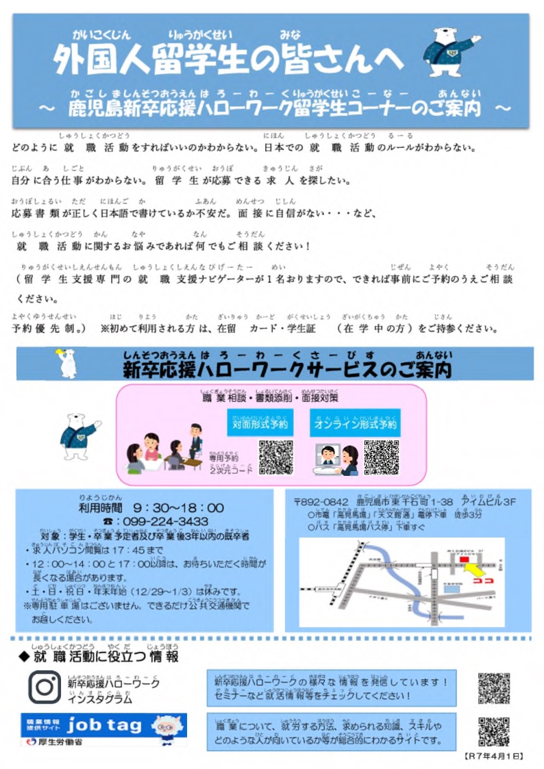鹿児島新卒応援ハローワーク留学生コーナーは、外国人留学生の皆さまと、外国人留学生の雇用を考えている事業主の皆さまを支援する厚生労働省の機関です。