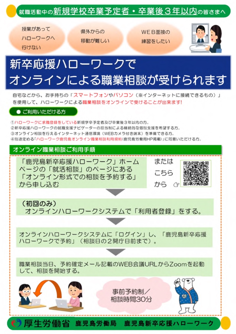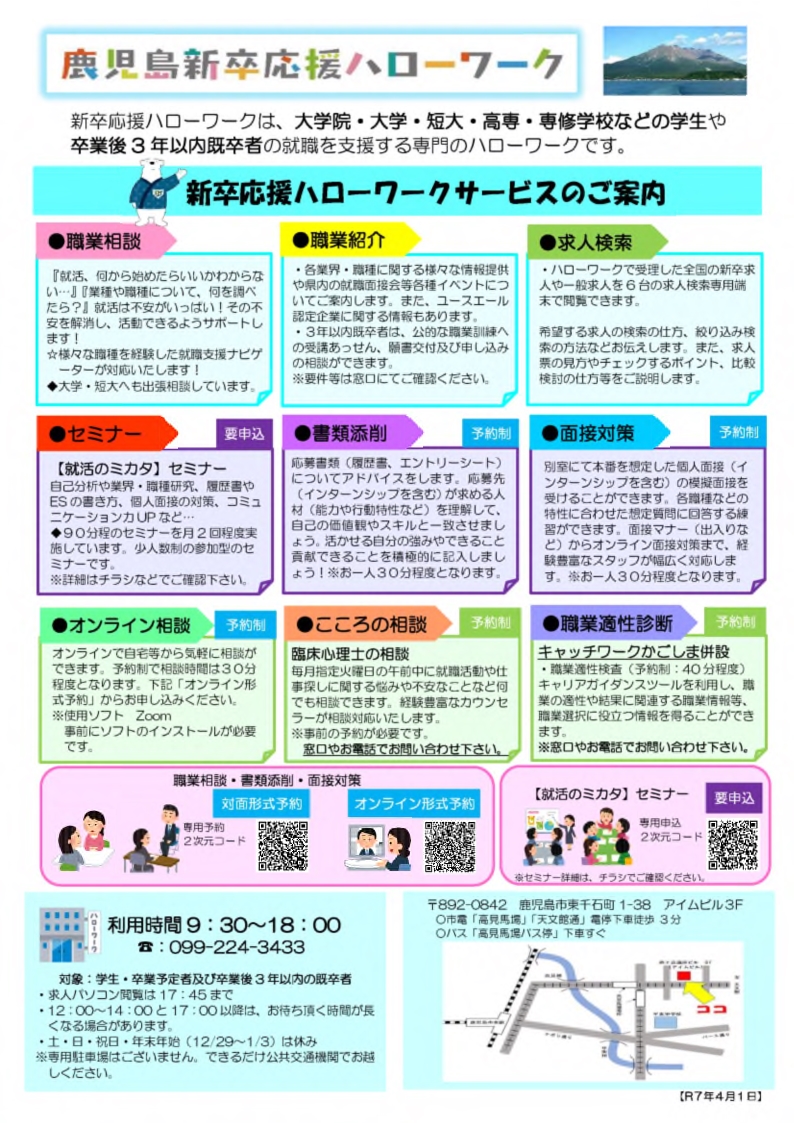 鹿児島新卒応援ハローワーク(099-224-3433)までお電話ください。