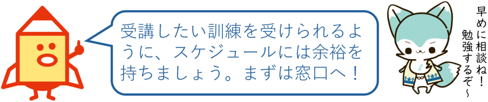 ハロートレーニングの受講申込については複数回の相談が必要です。事前に相談されていない場合は、受付期間最終日に受付できない場合がございますので、ご注意ください。