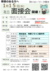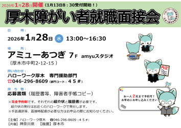 - 1月28日開催の厚木障がい者就職面接会の求人を公開しました!※受付は1月13日からです!