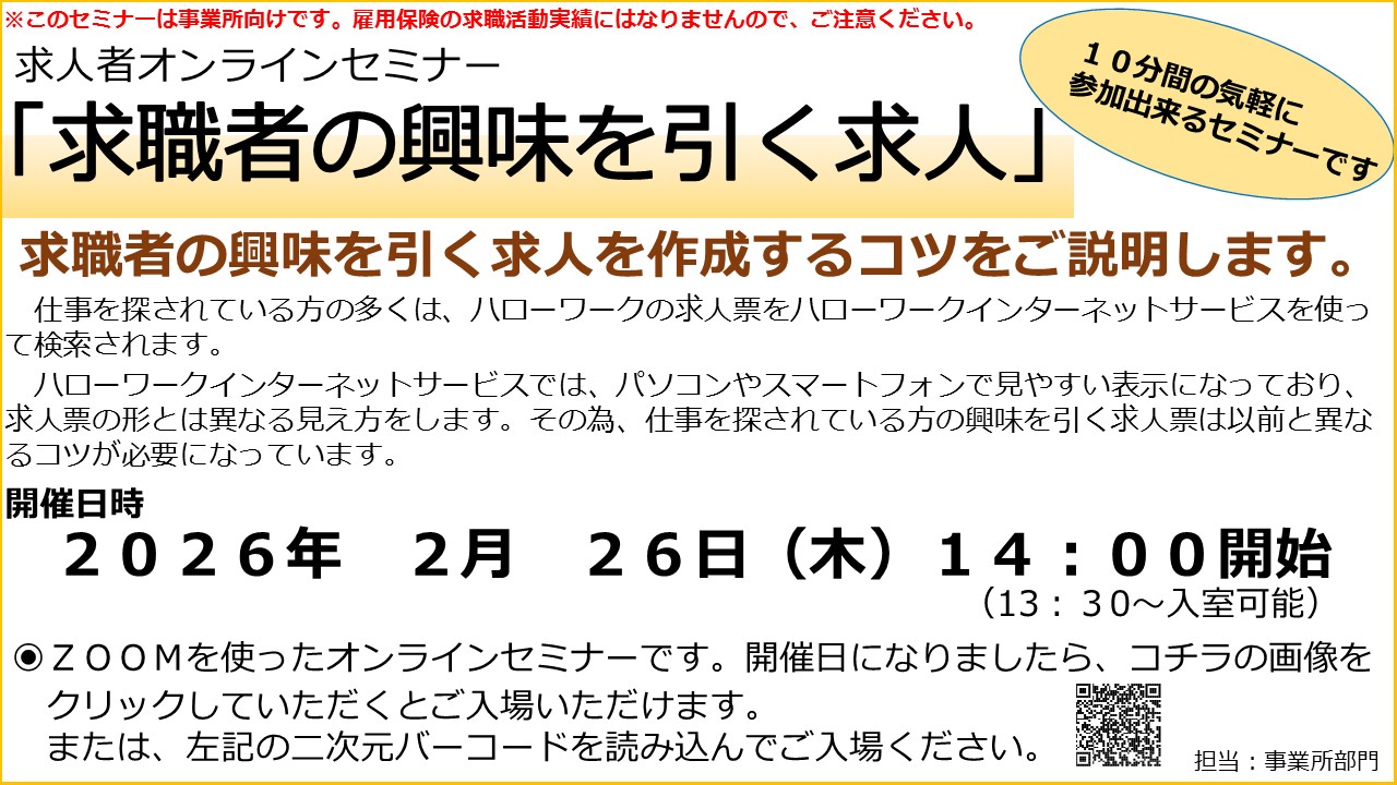 - 2026年02月13日 2月26日(木)求人者セミナーを開催します!※予約不要 ★当日はコチラからご入場になれます