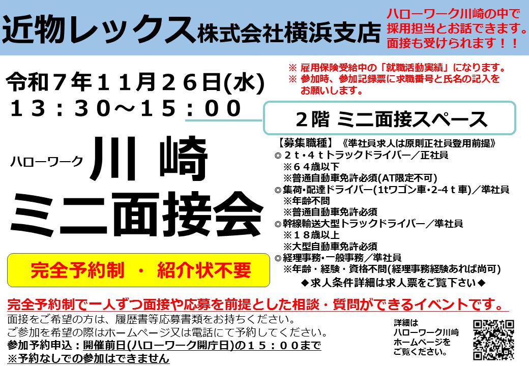 その際「11/26近物レックス株式会社横浜支店のミニ面接会参加予約希望」とお申し出下さい。