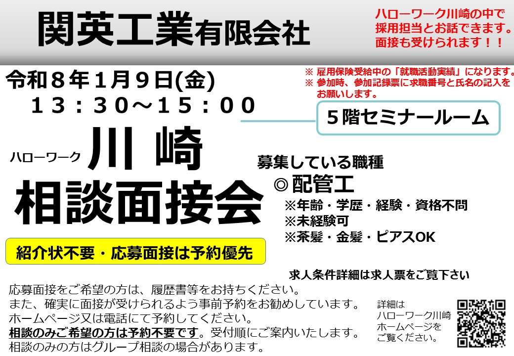 または、下記の問い合わせ先に電話をしていただき、「1/9関英工業相談面接会の応募面接予約をしたい」と