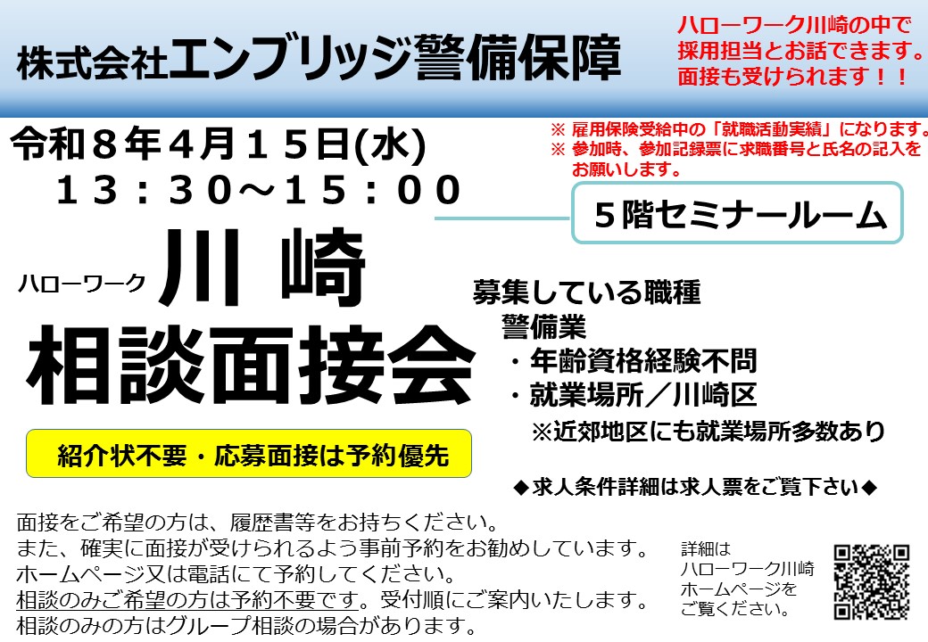 またはお電話で「4/15エンブリッジ警備保障相談面接会の応募面接予約をしたい」とお申込みください。
