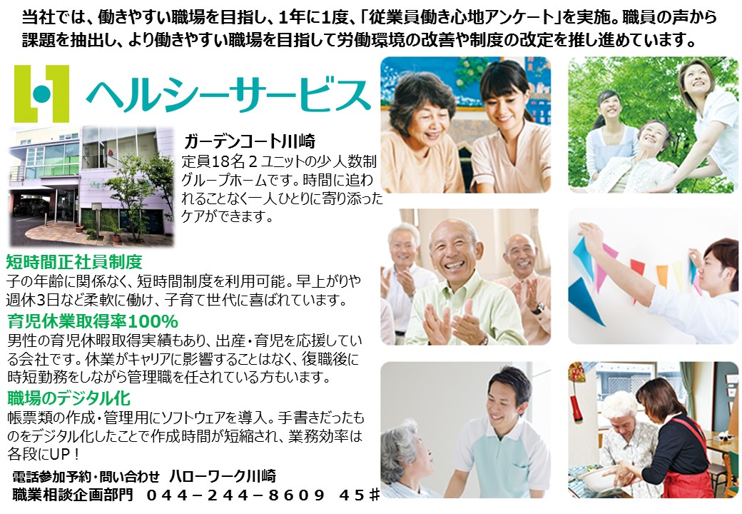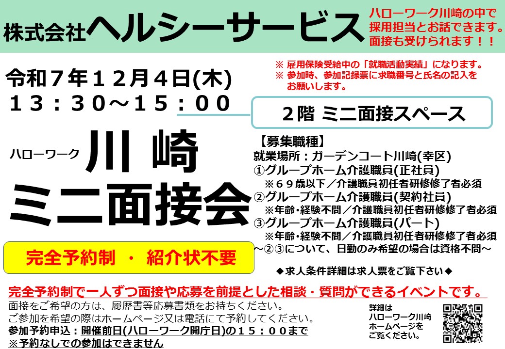 その際「12/4 ヘルシーサービスのミニ面接会、面接または応募前提相談予約希望」とお申し出下さい。