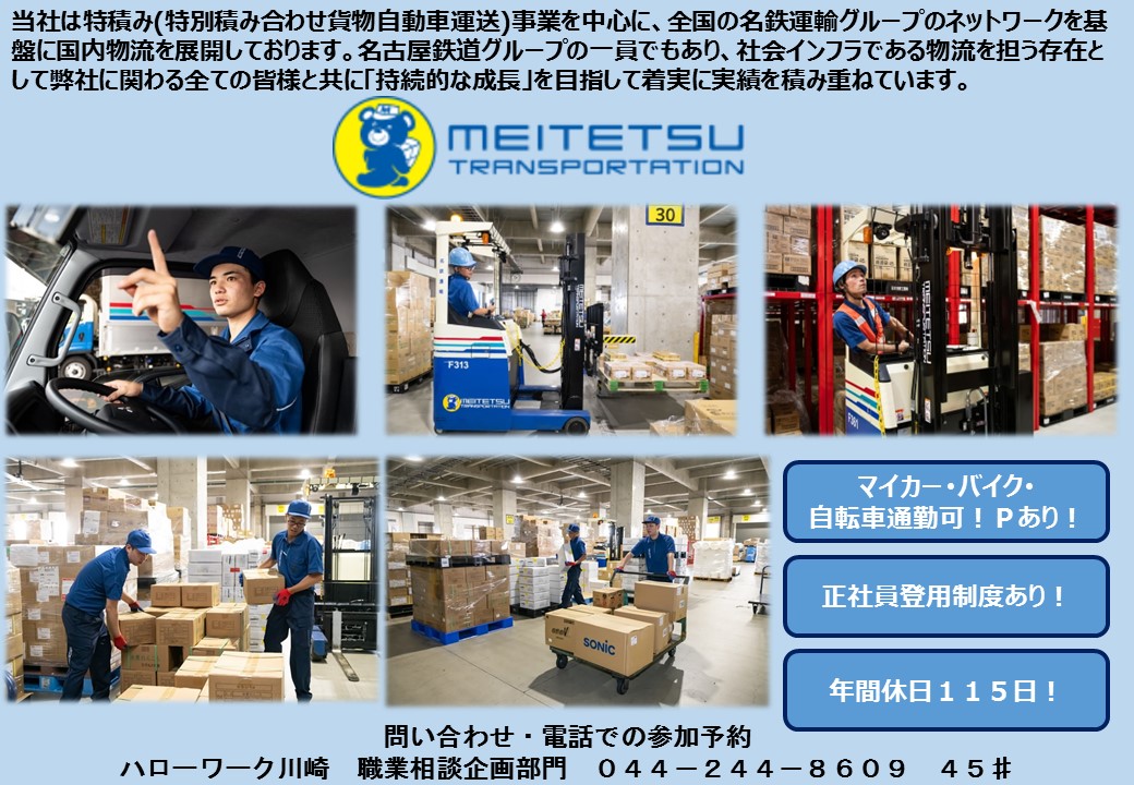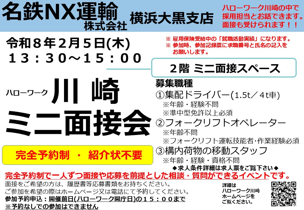 その際「2/5 名鉄NK運輸のミニ面接会、面接または応募前提相談予約希望」とお申し出下さい。