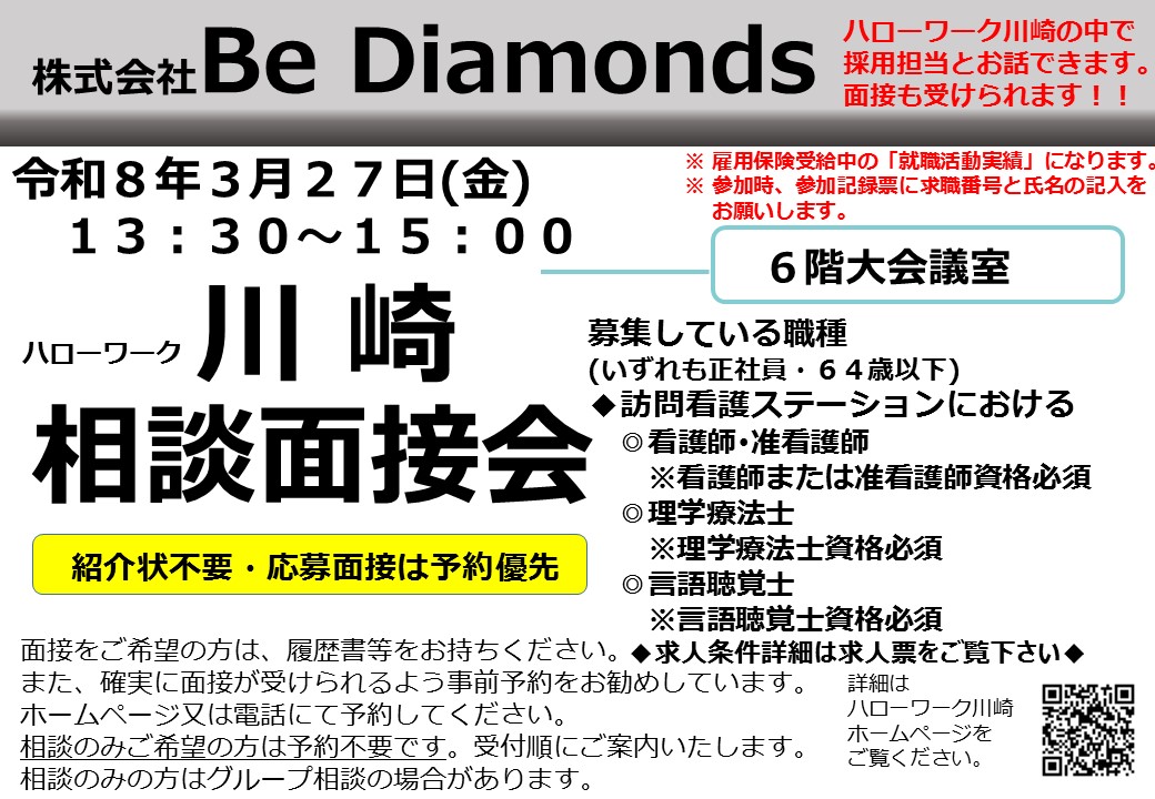 その際「3/27BeDiamonds相談面接会での応募面接予約希望」とお申し出下さい。