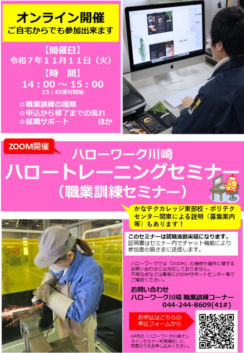 ※ハロートレーニングセミナーの内容は過去回と同内容になります。再度の受講はご遠慮ください。