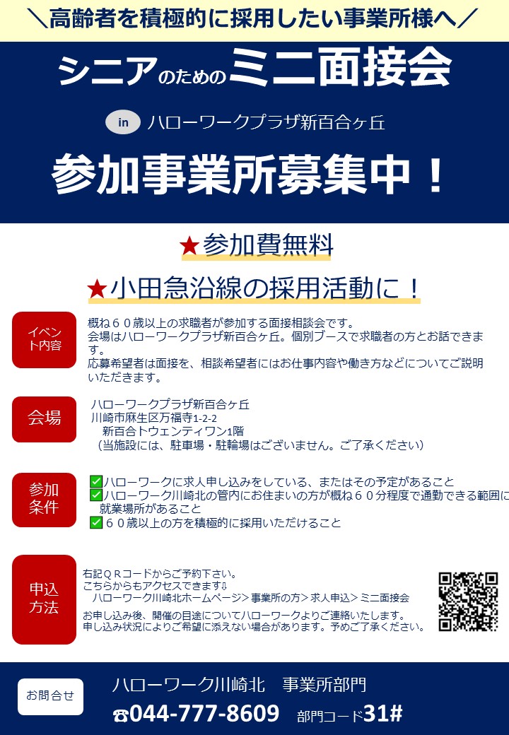 ハローワークプラザ新百合ヶ丘でミニ面接会を開催しております。面接や求人内容・会社情報の個別説明などをすることができます。二次面接や見学は後日事業所に出向いていただくこともできます。