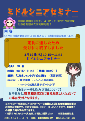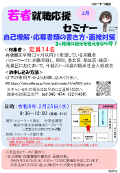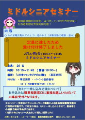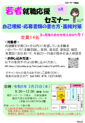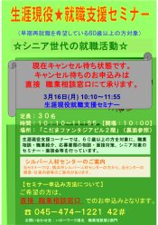 ※セミナーのお申し込み方法は各セミナーによって異なっております。中にはお電話では受付できず職業相談窓口限定でお申し込みを受け付けているものがございます(例:生涯現役★就職支援セミナー)。詳細は各チラシをご確認くださいませ。