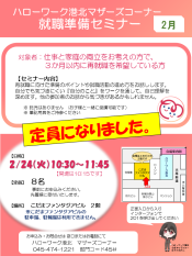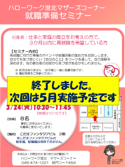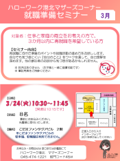 マザーズコーナーは、仕事と子育ての両立を目指す方や、出産・子育て・介護等により働いていた期間にブランクのある方、将来の両立を今から考えてみたい方など、その方のご希望に添ったお仕事探しを支援しています。