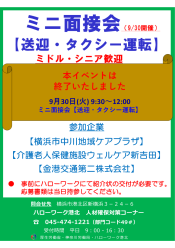 「ミニ面接会 送迎・タクシー運転」を令和7年9月30日に開催いたしました(参加企業は横浜市中川地域ケアプラザ/介護老人保健施設ウェルケア新吉田/金港交通第二(株)の3社)。