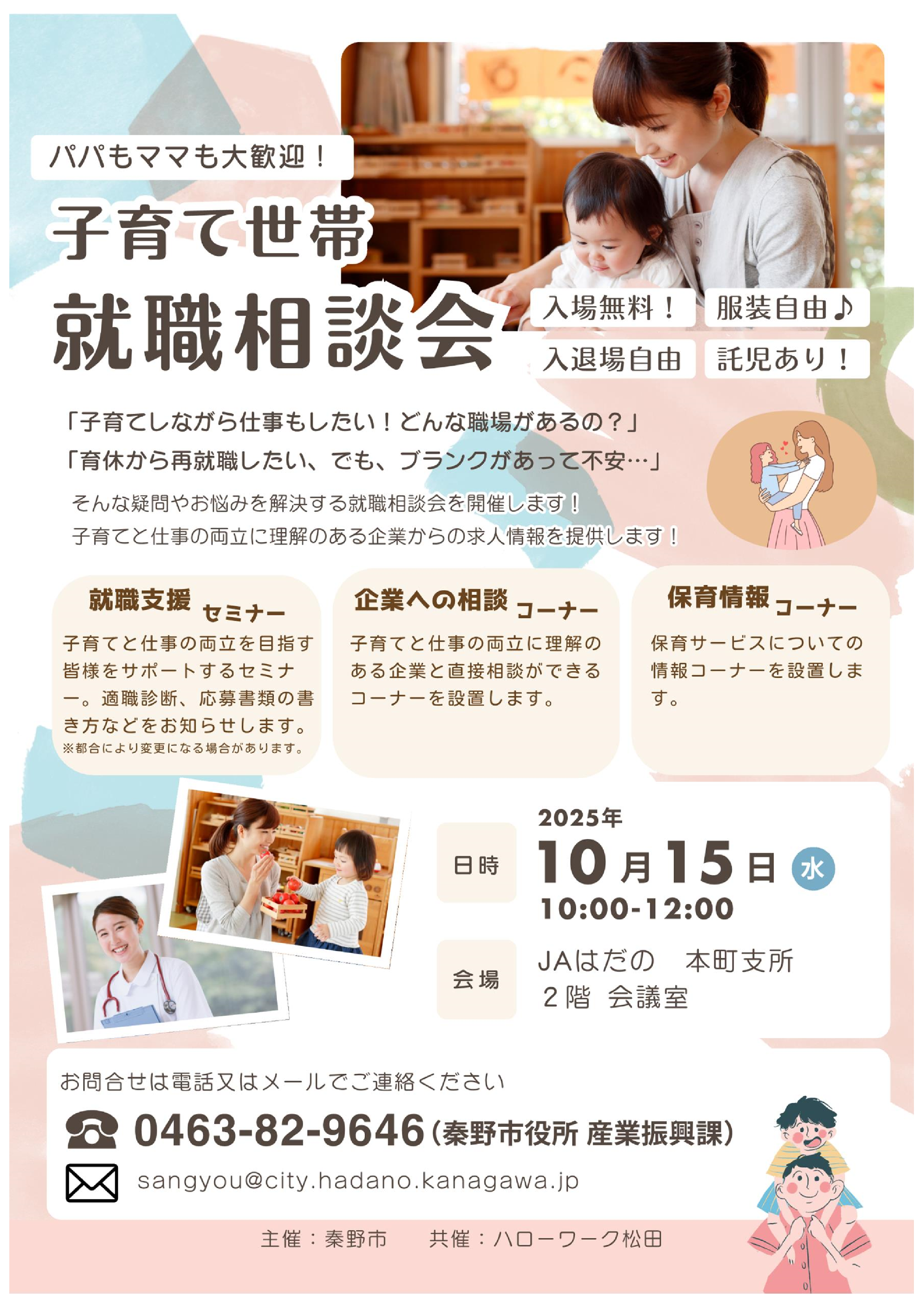 ●9月26日 10月15日(水)開催「子育て世帯 就職相談会」の参加者の募集を開始しました。